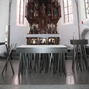 Die Neugestaltung von Volksaltar, Ambo und den Ministrant/innen-Bänken sind die markanteste Erneuerung in der Kirche. Aus dunkler Mooreiche gefertigt sind sie ein Zeugnis künstlerischer Gestaltung unserer Zeit.