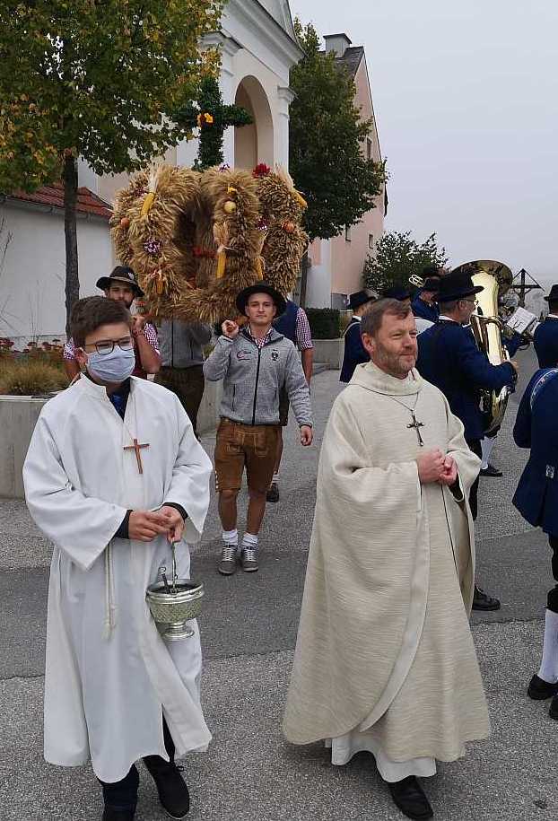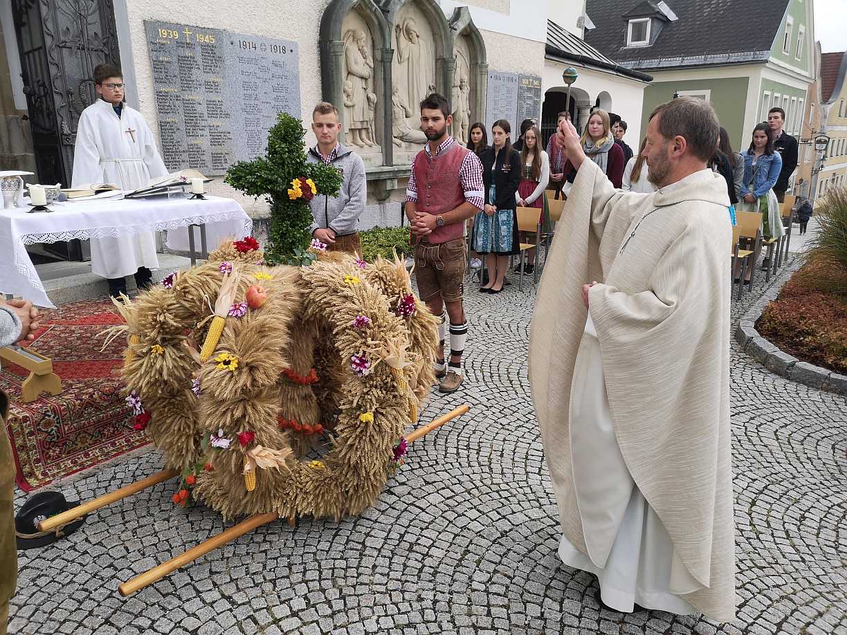 Begleitet von Abt Reinhold wurde die Erntedankkrone von vier Burschen der Landjugend zum Altar getragen. Danke an die Landjugend für das Vorbereiten und Schmücken der Erntekrone.