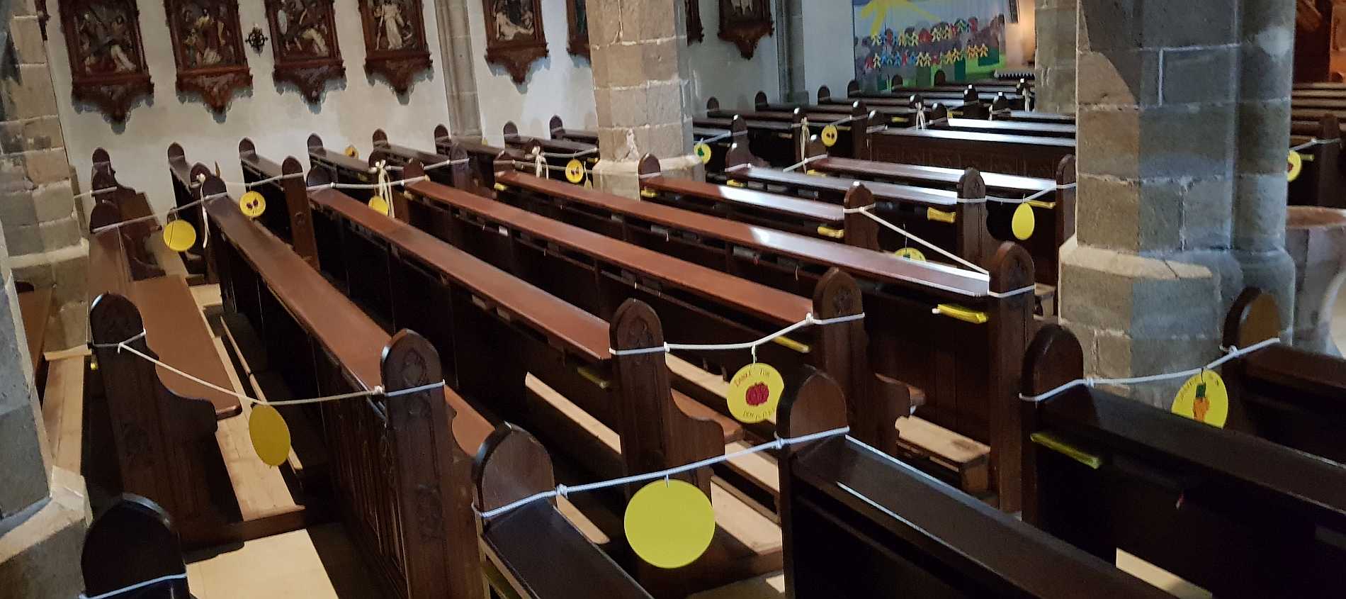 Da die Kindergartenkinder nicht als Gruppe teilnehmen konnten, haben sie im Vorfeld, die Absperrseile in der Kirche mit Bilder, wofür sie besonders Danke sagen, geschmückt.