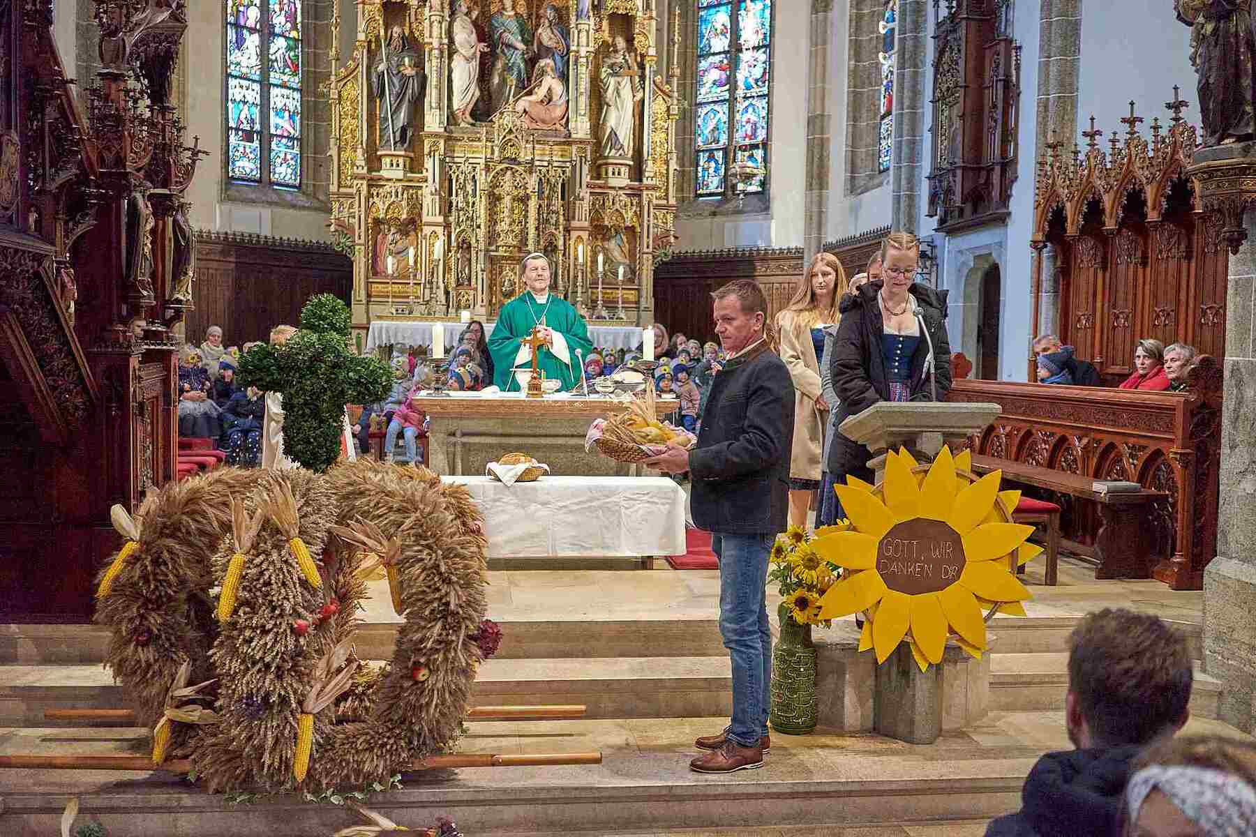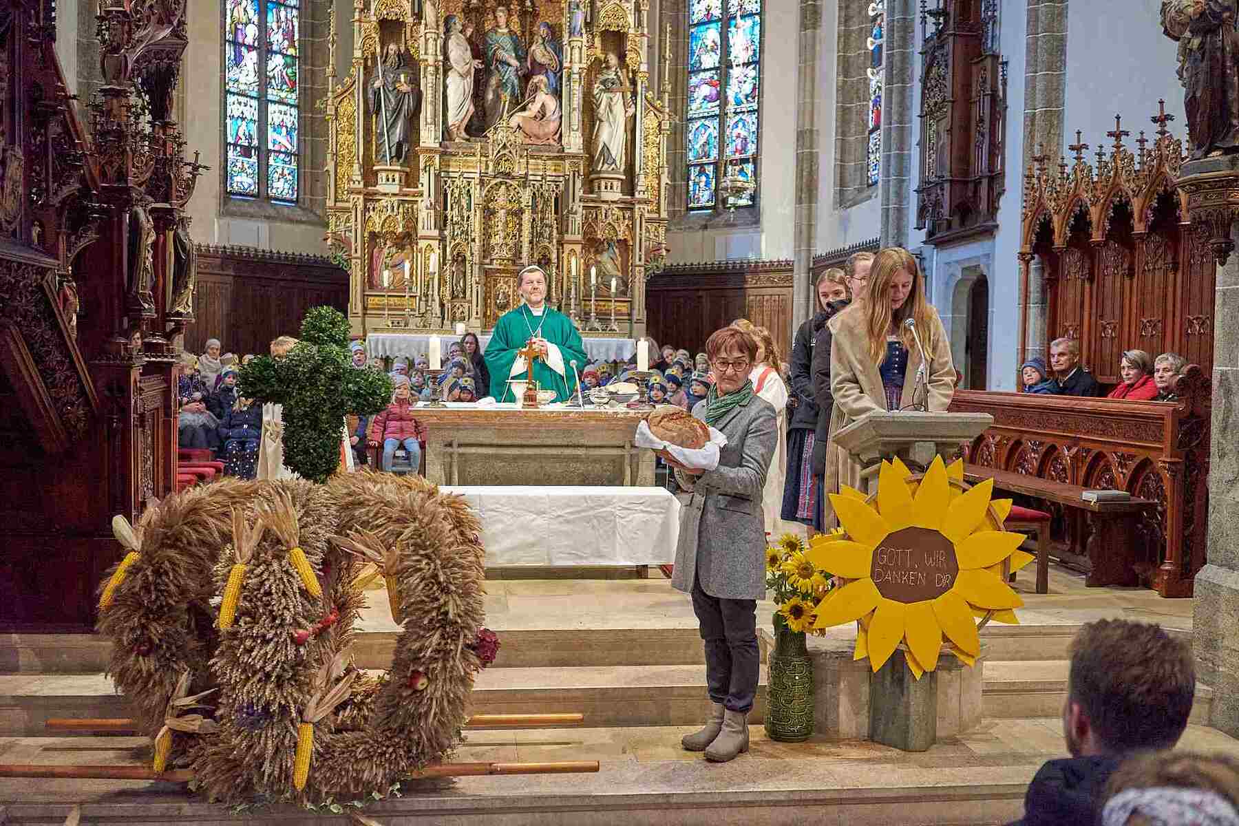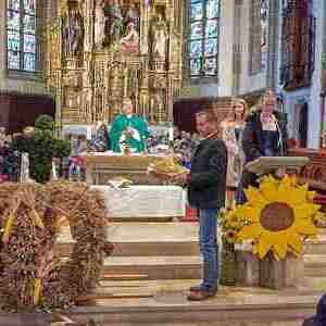 Die Erntegabe mit Getreide, Brot, Obst und Gemüse wurden von Vertretern der Ortsbauernschaft zum Altar gebracht. Dazu wurden von der Landjugend Texte zum Dank für die gute Ernte vorgelesen.