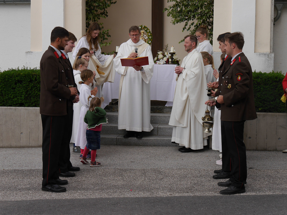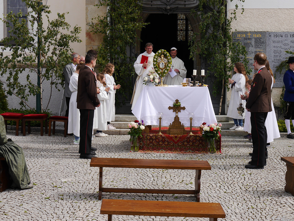 Eine Prozession im herkömmlichen Umfang war noch nicht möglich. Daher wurde das Allerheiligste vom Altar vor der Kirche zum Missionskeuz getragen, wo wie auch in früheren Zeiten, das Fronleichnamsfest mit dem 4. Altar gefeiert wurde. Zum feierlichen Abschluss wurde gemeinsam "Großer Gott wir loben dich" gesungen.