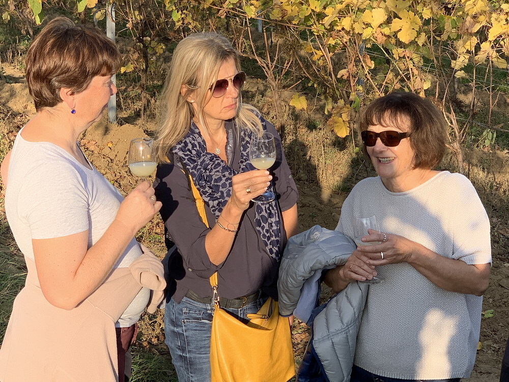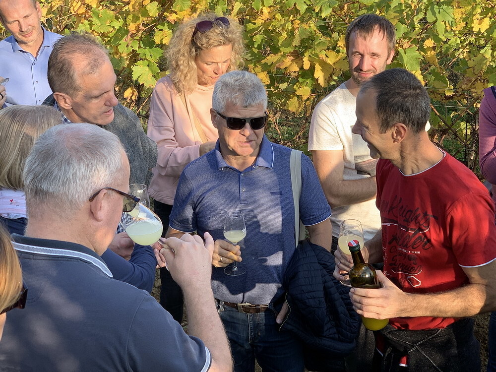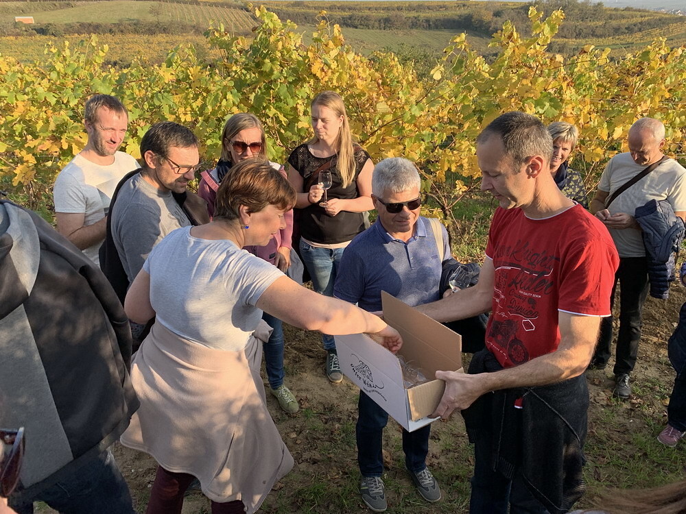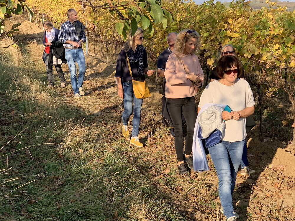 Eingedeckt mit frisch gebackenen Allerheiligen Stritzel aus der Dorfbäckerei ging es am Nachmittag weiter nach Poysdorf, wo wir uns mit Eva und Wolfgang Schodl trafen und mit ihnen einen Spaziergang durch ihre Weingärten unternahmen. Nach der gemütlichen Wanderung bei strahlend sonnigem Herbstwetter waren wir bei Familie Schodl zu einer zünftigen Jause geladen.