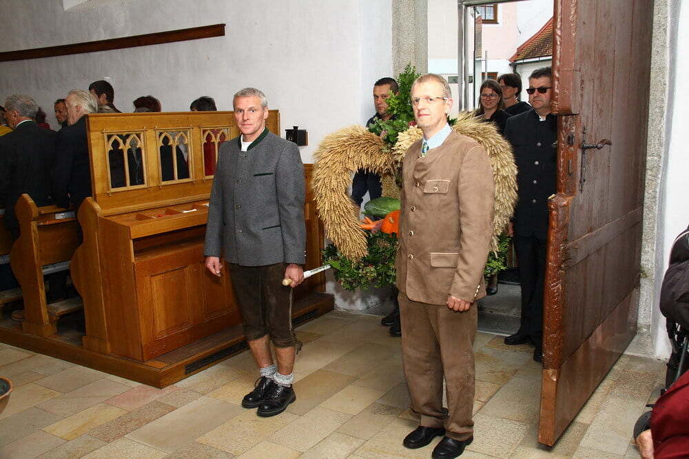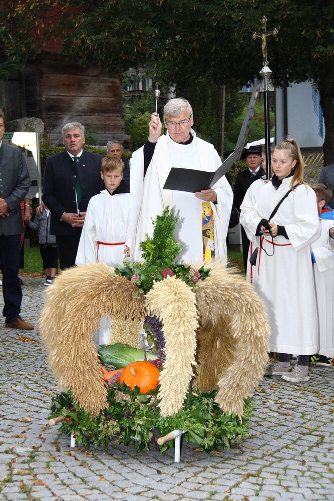 Viele Gründe um DANKE zu sagen. Um 09.00 Uhr wurde die wunderschön gebundenen Erntekrone beim Ortsbrunnen von Pfarrer Franz Mayrhofer gesegnet und anschließend von den Grünbacher Jungbauern in einem Festzug in die Kirche getragen.