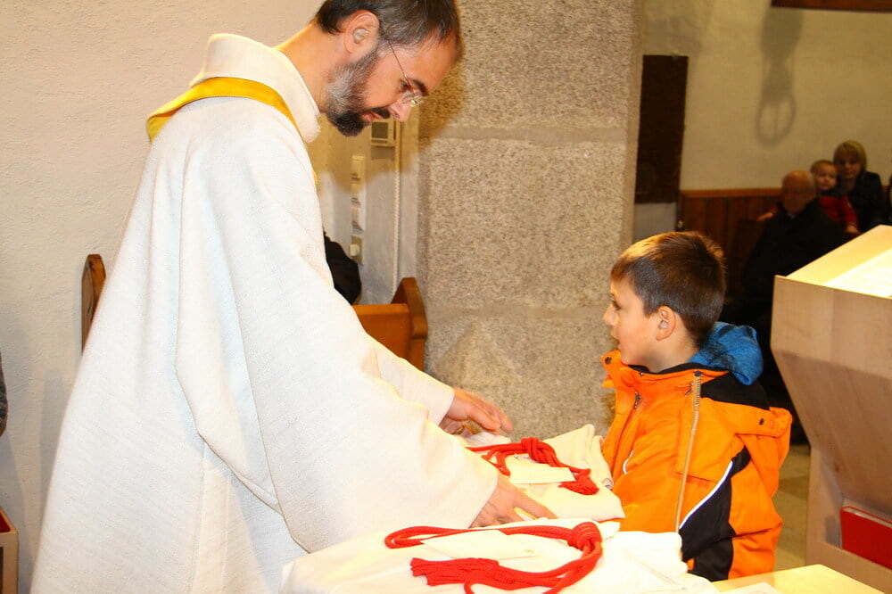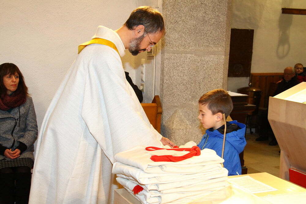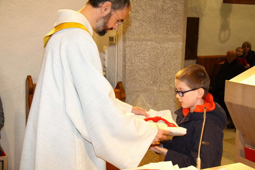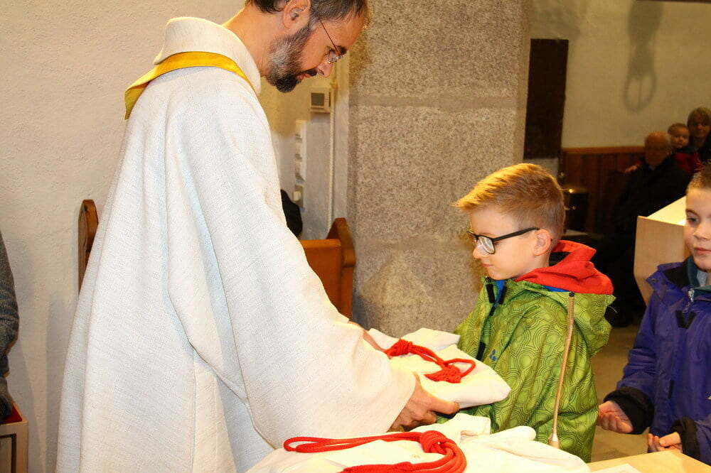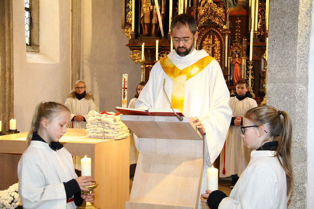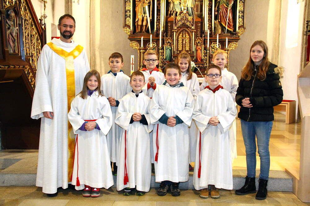 Seit heute, Christkönig, werden unsere Minis in Grünbach von acht jungen Mädchen und Burschen bei ihrem wichtigen Dienst beim Gottesdienst unterstützt. Nach der Predigt stellte unser Pfarrassistent Peter Keplinger alle namentlich vor und überreichte ihnen ihr neues "Arbeitsgewand". Nach der Einkleidung übernahmen die jungen Minis gleich den Ministrantendienst für den Rest der Wortgottesfeier.