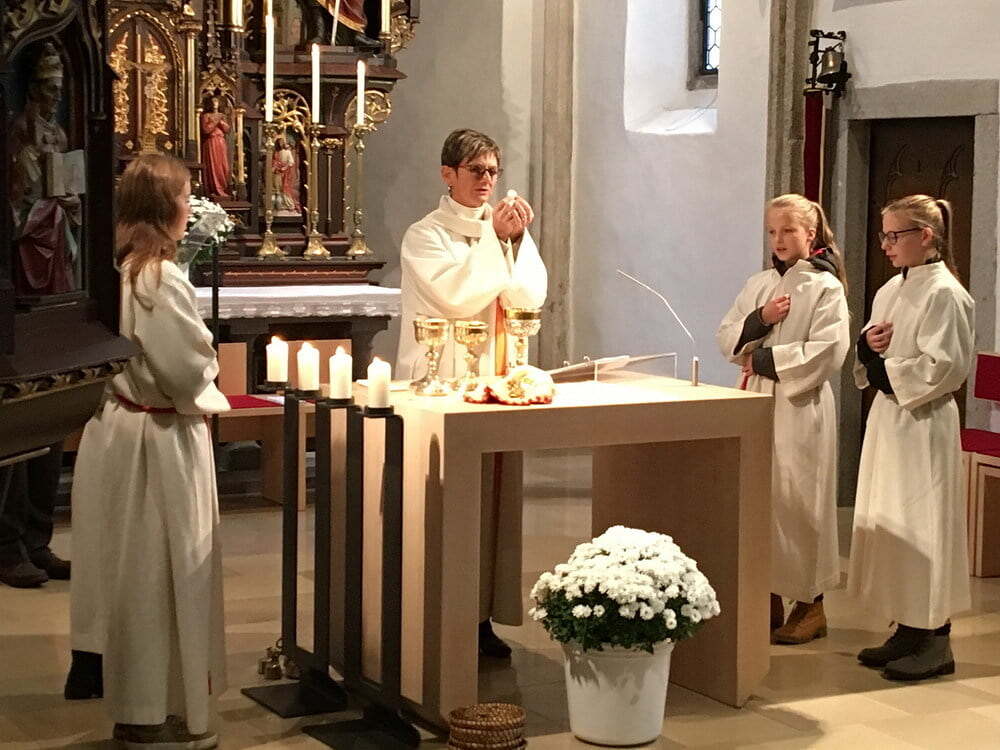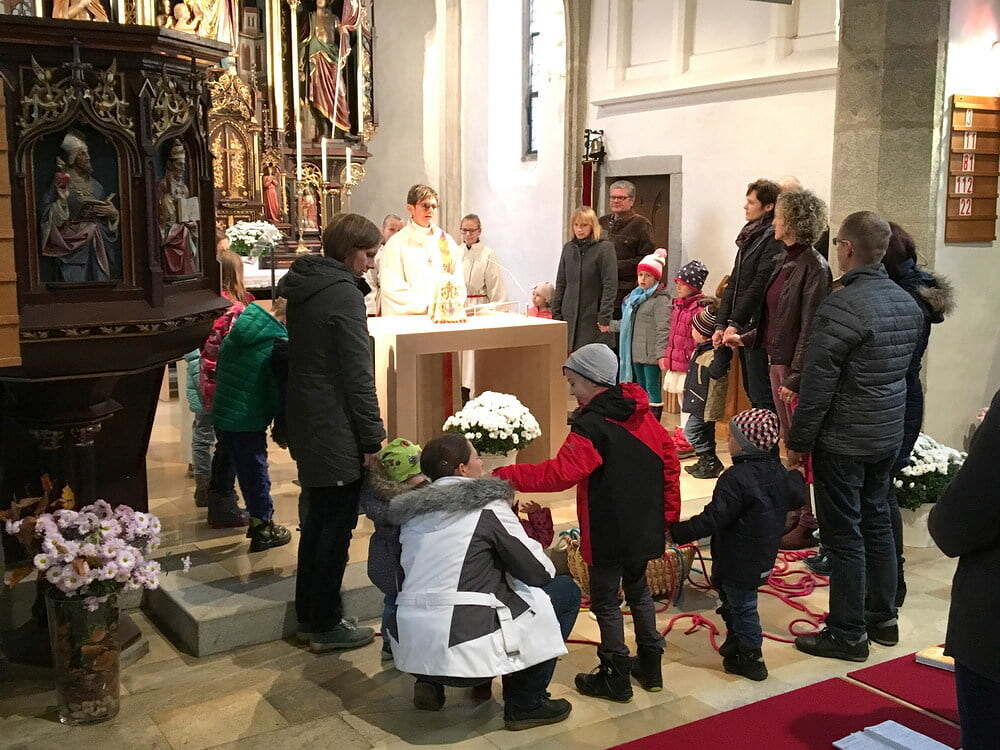 13 Kinder hielten sich am roten Seil fest und zogen gemeinsam in den Kirchenraum ein ……. Das Bild des roten Fadens zog sich dann durch die Wortgottesfeier: der Faden, der uns mit unseren Mitmenschen verbindet, wenn genau dieser gerissen scheint, kommt einem das wie großes Unglück vor. Der Faden zu meiner Umgebung, zur Umwelt, zum Universum, den man dann nicht sieht, wenn einem Müll im Wald unterkommt oder von Welterwärmung die Rede ist. Und derselbe Faden ist es, der uns mit Gott verbindet, der uns die Gewissheit gibt, dass wir geführt sind. Das Bilderbuchkino lieferte uns kindliche Bilder für dieses große Thema. Und im Meditationstext ist die Zusammenfassung für Erwachsene enthalten:
