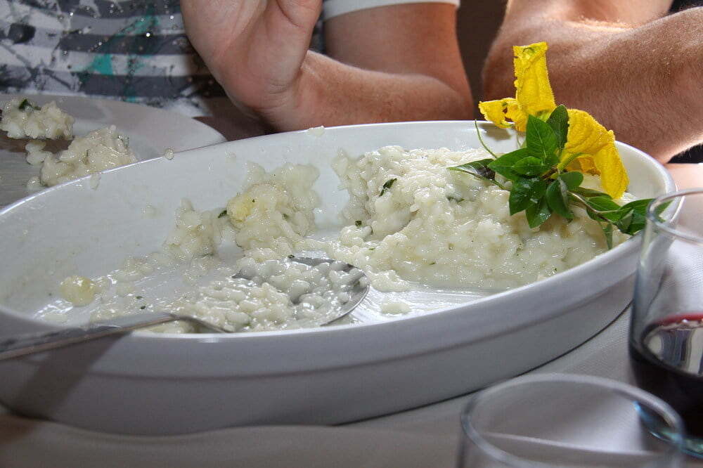 Im Herzen des Piemonts hat der Risotto-Reisanbau seit dem 15. Jahrhundert Tradition. In einer mittelalterlichen Abtei, die im 11. Jahrhundert von Zisterziensermönchen gegründet wurde, servierte man uns an einer schön gedeckten Tafel zweierlei Risotto, Tischwein und Gelati. Danach erfuhren wir viel über die Geschichte des Reisanbaus, die regelmäßige Flutung der Felder mit Gletscherwasser, die mühevolle Handarbeit in frühen Zeiten und dem modernen Reisanbau.