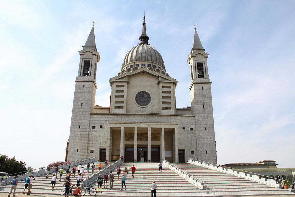 Colle Don Bosco: bildet in der Nähe des Geburtshauses Don Boscos ein großes modernes Pilgerzentrum. Besonders der Innenraum aus Holz beindruckte uns sehr.