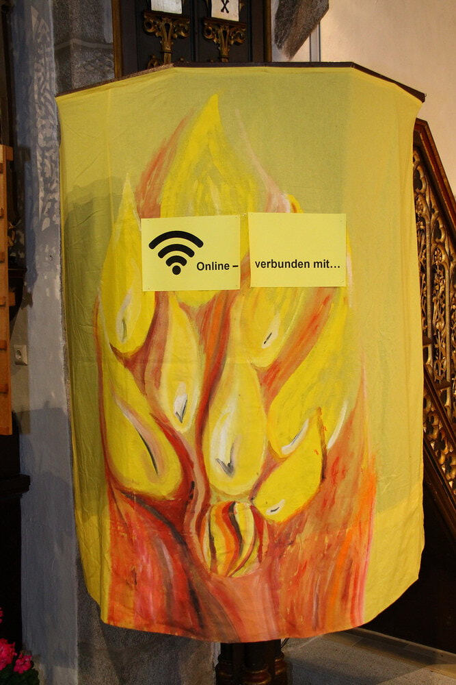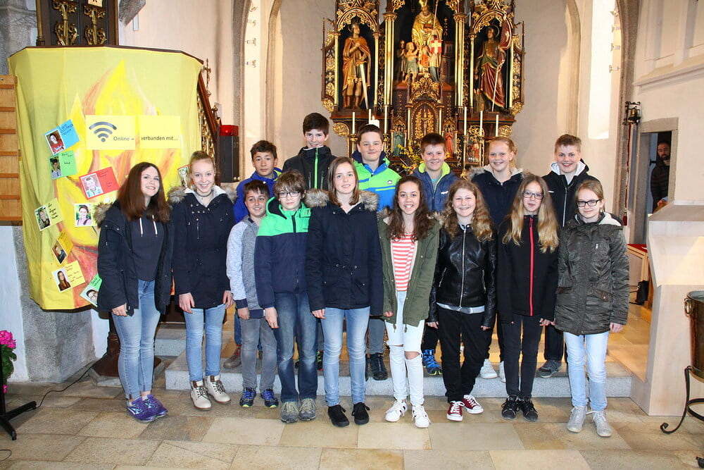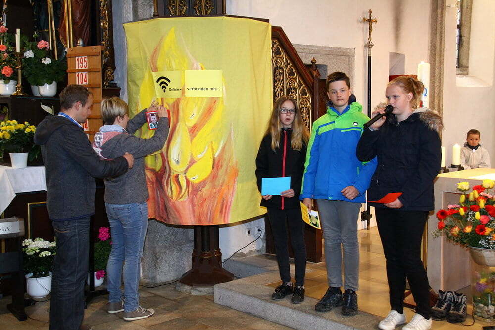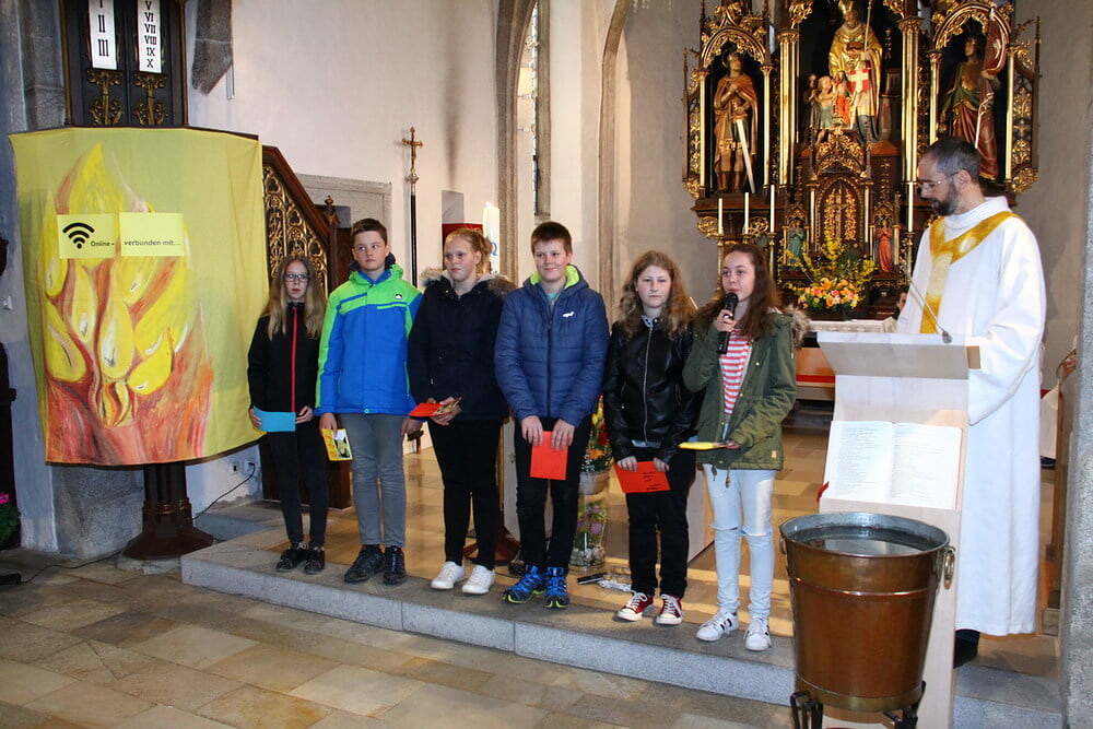Beim anschließenden Vorstellungsgottesdienst „Online - verbunden mit …“ stellten sich die Firmlinge dann vor und brachten den Gottesdienstbesuchern unter anderem die sieben Regeln für ein Telefongespräch mit Gott näher: