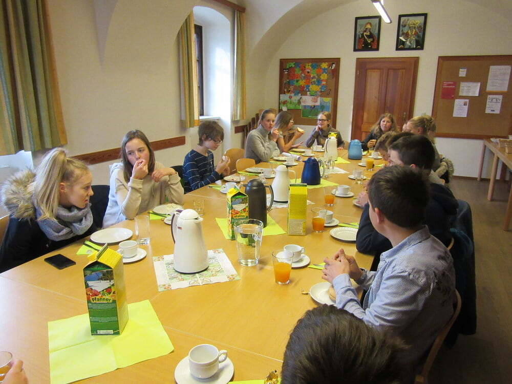 In Begleitung von Sigrid und Eva-Maria ging es dann Richtung Schlag und auf dem Kreuzweg zurück nach Grünbach. Am Weg brachten die beiden den Firmlingen das Tagesevangelium näher. Aufgetankt mit dem gewonnenen Wissen rund um das Thema „Beziehung“ wanderten alle wieder zurück zum Pfarrhof, wo ein reichhaltiges Frühstück auf sie wartete.