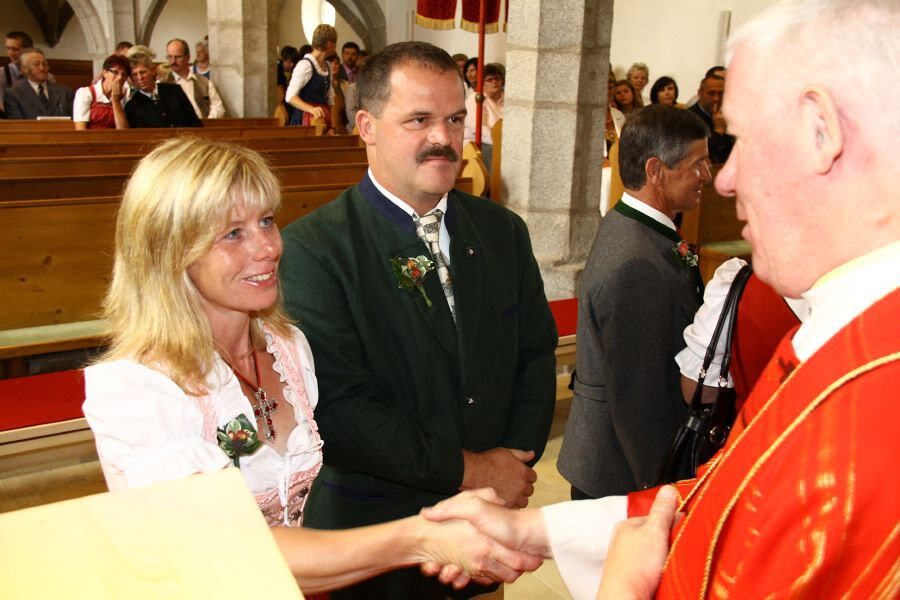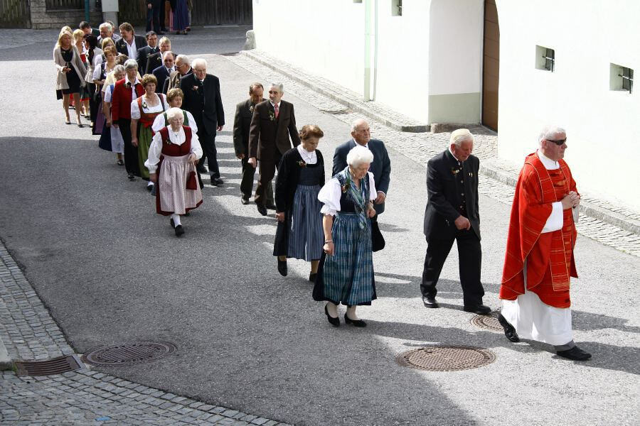 Mit ihren Verwandten zogen die Jubelpaare, geführt von den Klängen der Musikkapelle, in die Kirche ein. Der Gottesdienst wurde musikalisch vom Grünbacher Frauenchor umrahmt.