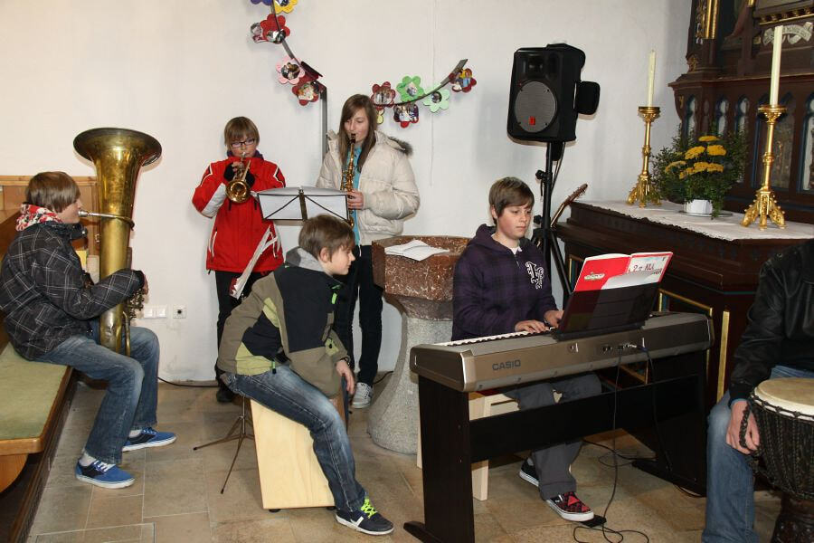 Da einige der Firmlinge ein Instrument spielen, hat sich auch ein kleines, interessant bestücktes "Firmensemble" gebildet und zwei rhythmische Stücke für die Firmvorstellmesse einstudiert.