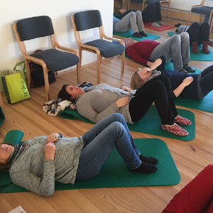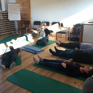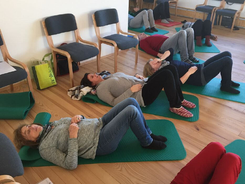 Gemeinsam machten wir Übungen zum situationsangepassten Stimmeinsatz, für klarere Artikulation und erprobten die Alexandertechnik. Eine Technik, uns besser wahrzunehmen – mit weniger Spannung, also mehr Freiheit in den Gelenken und Muskeln. Hierzu durften wir es uns nach dem Mittagessen auf einer Matte gemütlich machen. Naja, obwohl gemütlich …. für manche war das Singen in Liegeposition anstrengend.