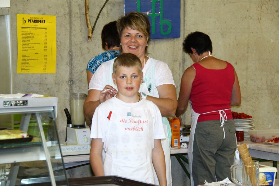 Aus der Festküche lockten die Düfte von Schweinebraten, Schnitzel, Bosner & Co zum Mittagstisch. Darunter hatte sich heuer zum ersten Mal der Duft von hausgemachten Gemüselaibchen gemischt! Naschkatzen wurden von der KFB wieder mit leckeren Mehlspeisen, Kaffee und Eis-Palatschinken verwöhnt.