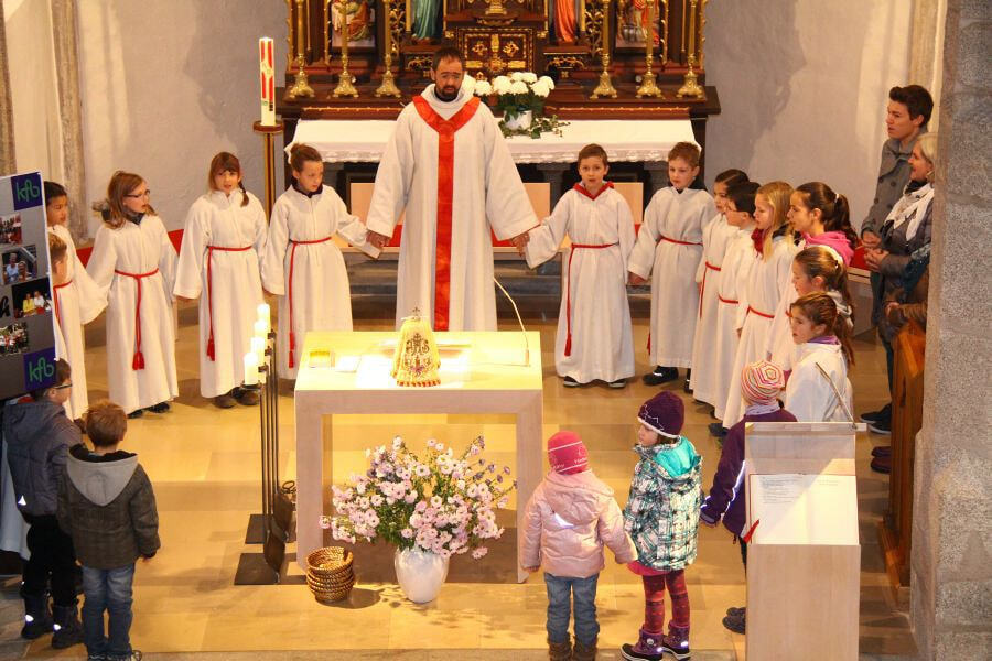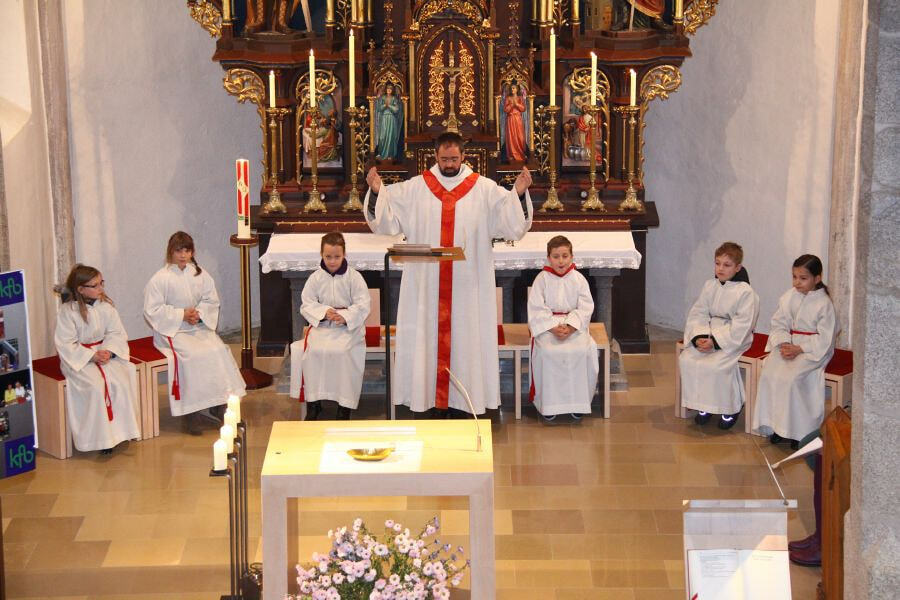 Nach dem "Einkleiden" in der Sakristei übernahmen die jungen Minis von ihren älteren Kolleg(inn)en den Dienst und durften das erste Mal aktiv in ihrer neuen Funktion mitarbeiten.