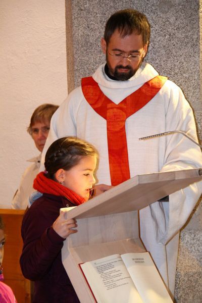 Peter überreichte ihnen bei der Wortgottes Feier ihr neues Ministrantengewand.