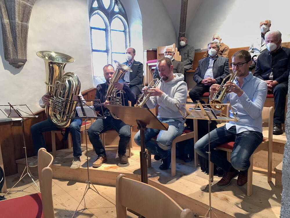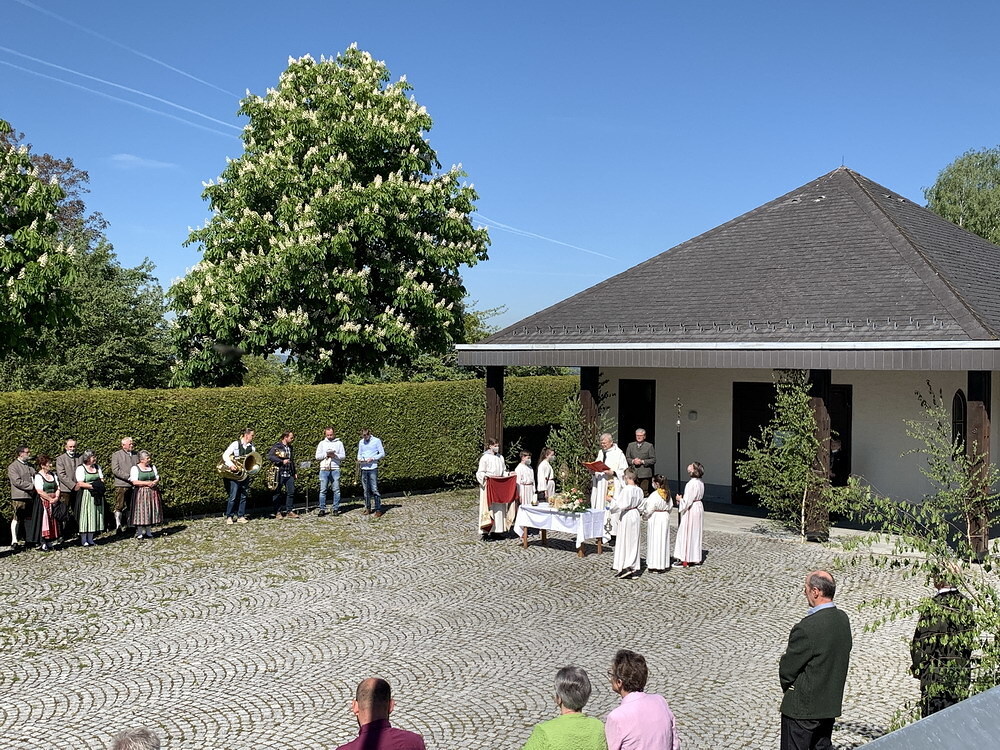 Nun ist Kreativität gefordert und so wird kurzerhand einer der Prozessionsaltäre auf den Kirchenplatz verlegt und schon kann man nach dem Gottesdienst in der Kirche eine "Miniandacht" unter stahlend blauem Himmel, umrahmt von den Klängen einer "Minimusikkapelle" von 4 Musikern, abhalten. Ein rundum gelungenes "Fronleihnam light".