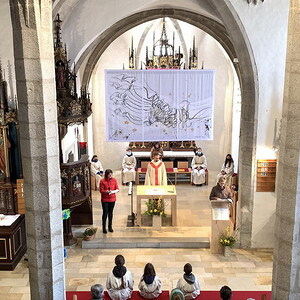 Zu Beginn die Segnung der Palmbesen am Kirchenplatz, umrahmt von den Klängen der Bläser des Musikvereines. Anschließend der feierliche Einzug in die Kirche unter festlichem Gesang des Kirchenchores mit Orgel und Geigenbegleitung.