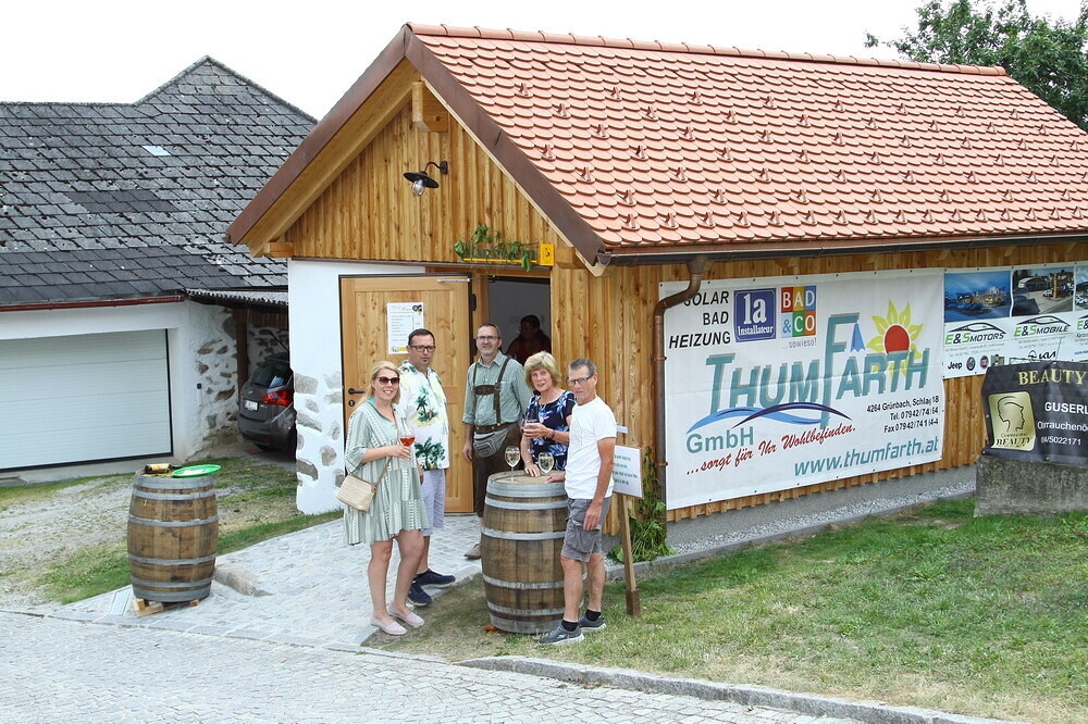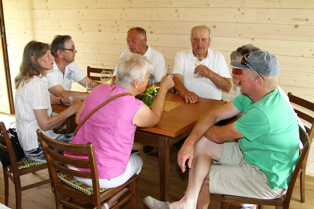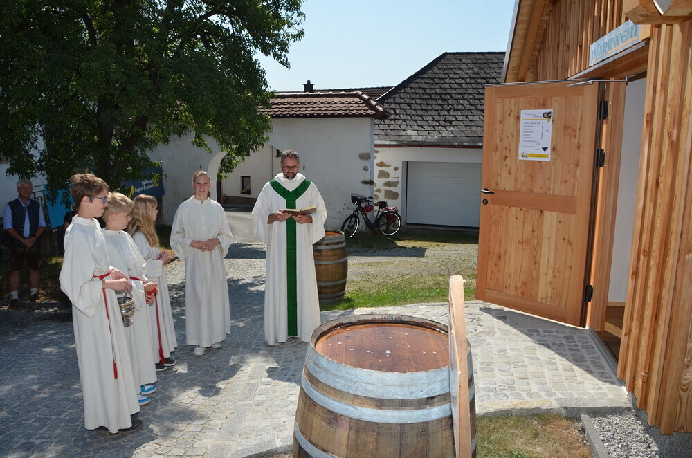 Anschließend nach dem Gottesdienst segnete PfA Peter A. Keplinger die fertig gestellte „Pfarrhof-Gartenhütte“, welche auch gleich für die Ausschank unseres Pfarrweines genutzt wurde. Im angrenzenden Pfarrgarten konnte dann gemütlich das eine oder andere Glas Wein im Schatten der Obstbäume getrunken werden.