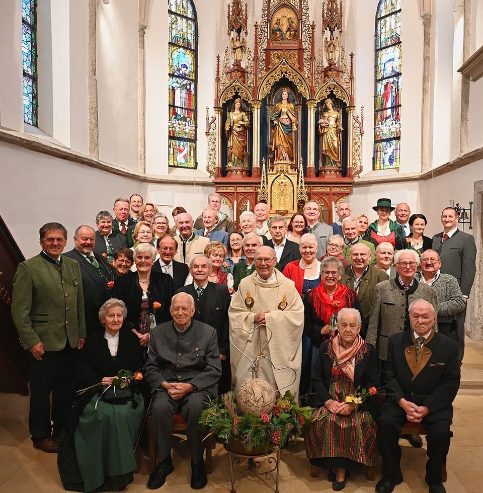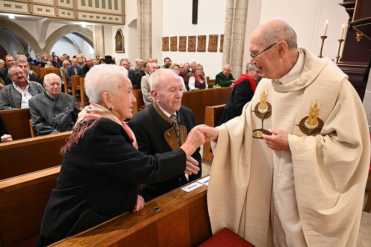Dazu versammelten sich 19 Jubelpaare, darunter 1 Juwelenpaar mit 72,5 Hochzeitsjahre, 1 Eisernes Paar mit 65 Hochzeitsjahre, 2 Diamantene Paare mit 60 Jahre, 9 Goldene mit 50 Jahre und 6 Silberne mit 25 Hochzeitsjahre vor der Pfarrkirche Gschwandt. Gemeinsam marschierten alle Jubelpaare, voran Pfarrer Alois Kainberger mit Ministranten/innen und dahinter auch Bürgermeister Fritz Steindl und sein Vize Mathias Buchinger in die Kirche ein. Mit musikalischer Begleitung des Kirchenchor Gschwandt unter Leitung von Annemarie Hauer wurde eine besinnliche und feierliche Messe abgehalten und gemeinsam das Hochzeitsversprechen erneuert.