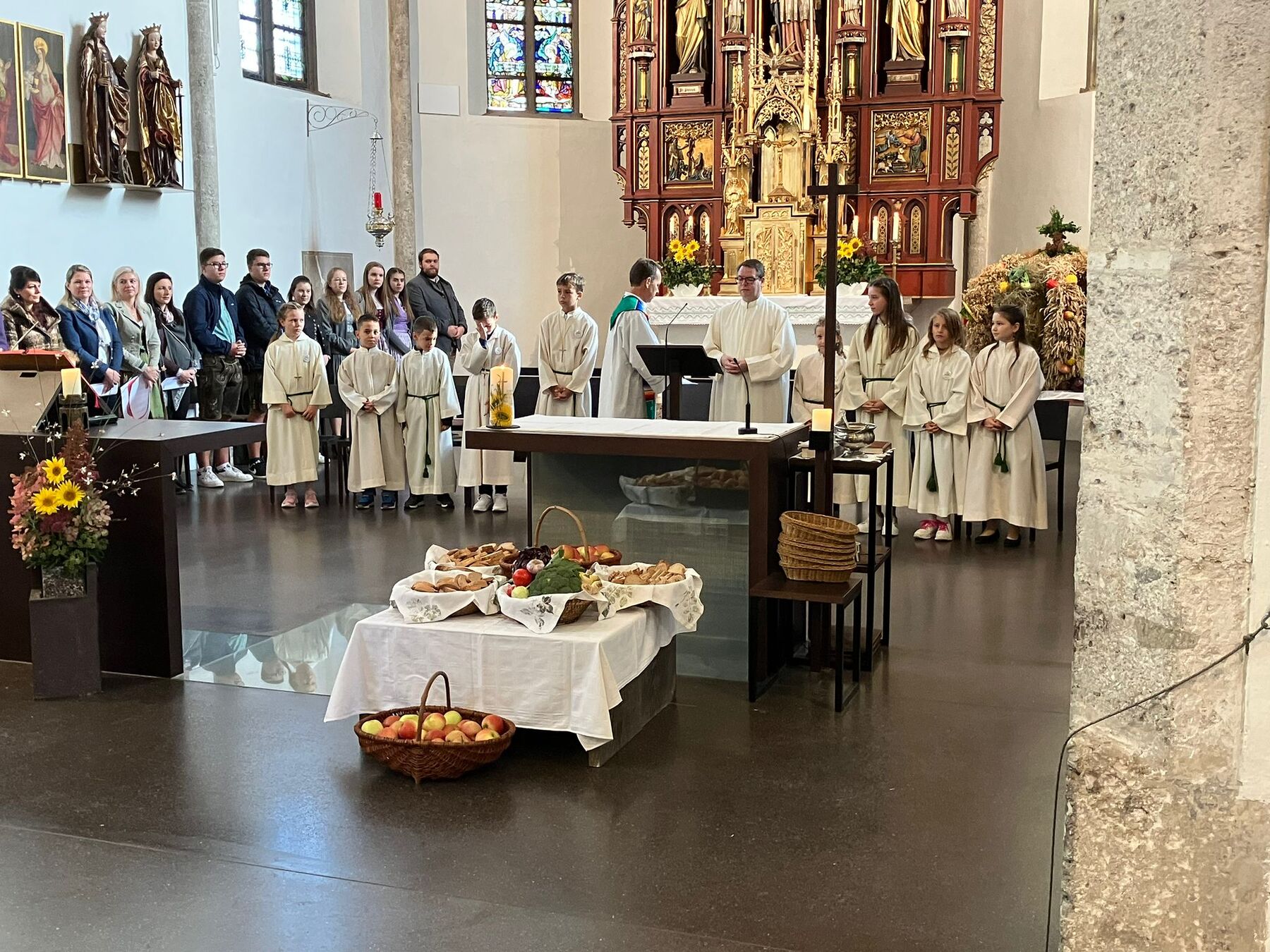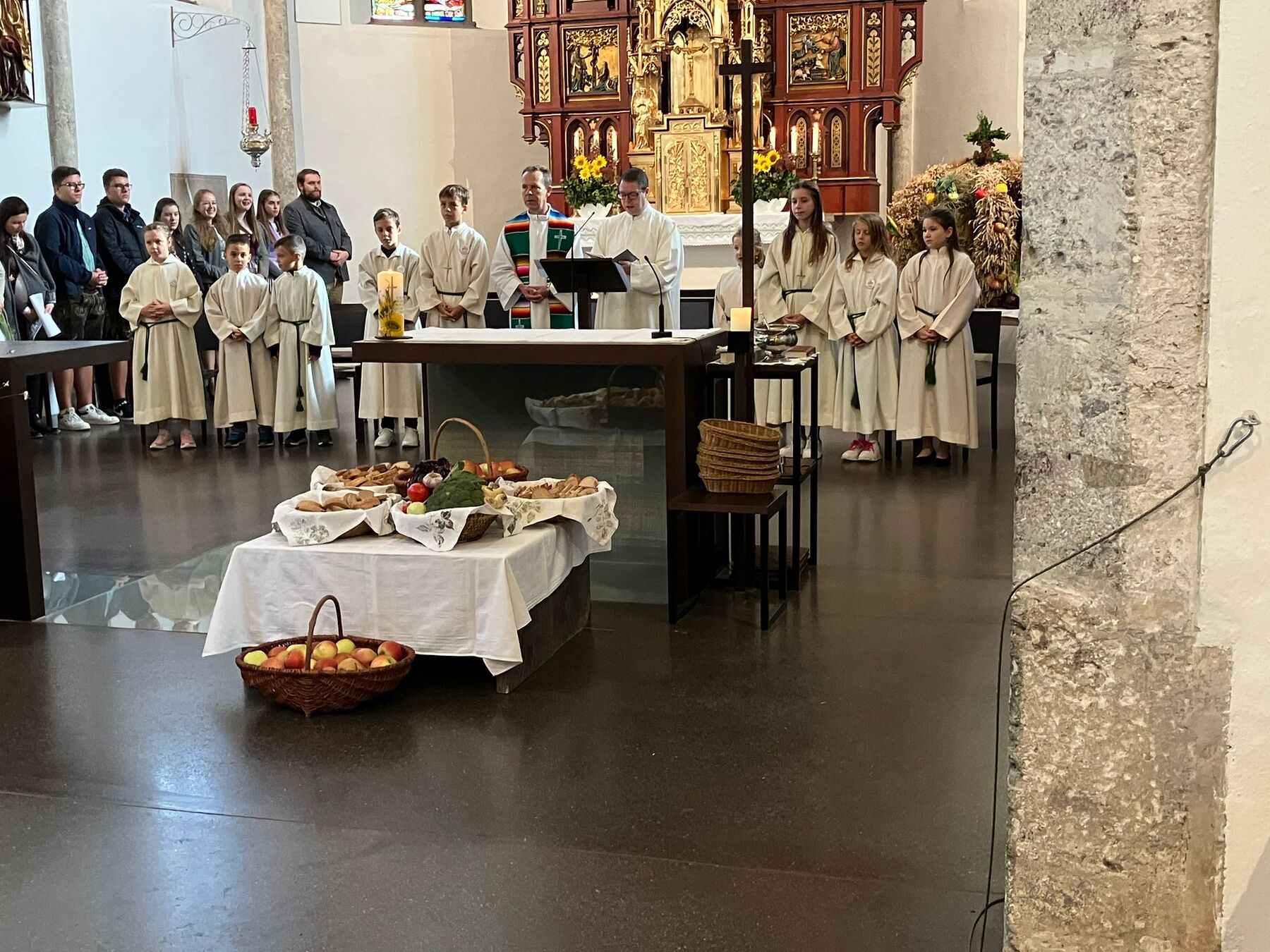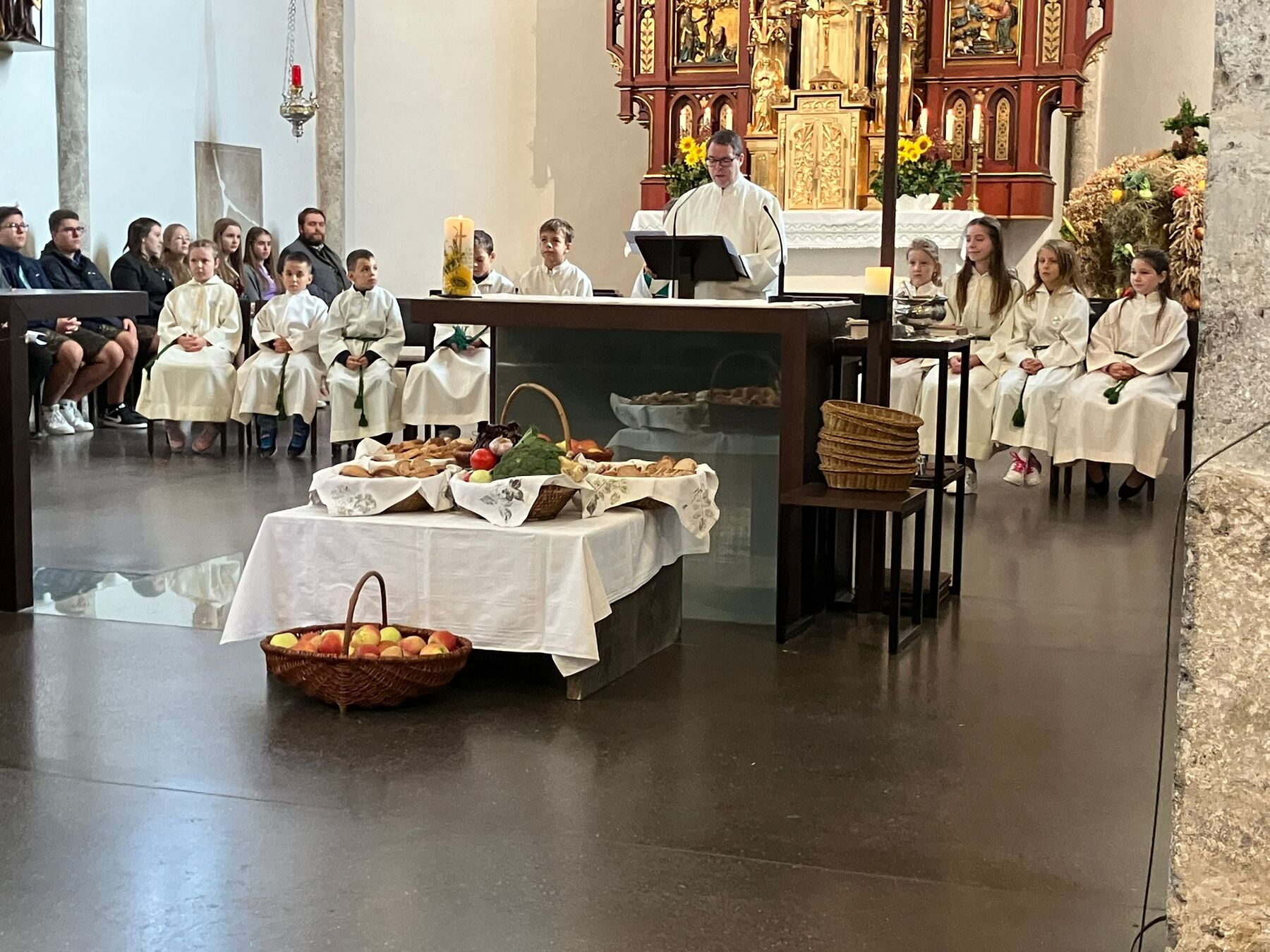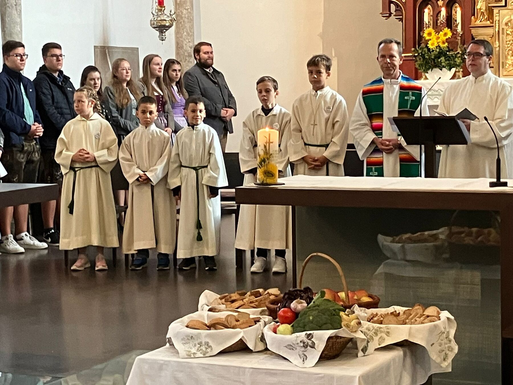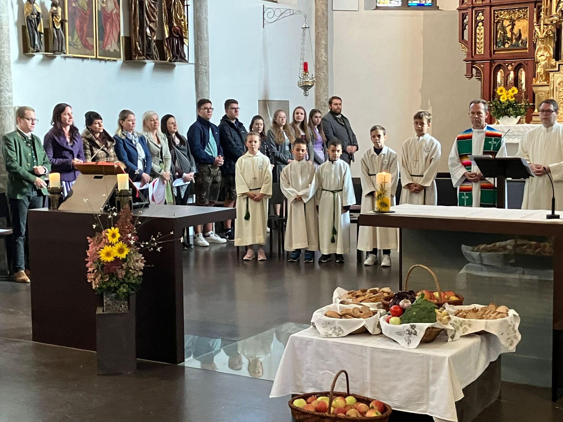 Pater Carlos von den Steyler Missionaren feierte gemeinsam mit unserem angehenden Diakon Roger Sohler den Festgottesdienst, der musikalisch von der Musikkapelle Gunskirchen gestaltet wurde. Bei der Predigt fragte unser angehender Diakon Roger Sohler nach dem Sinn des Erntedankfestes. Es geht nicht nur ums Danke sagen zur Ernte sondern ums Danke sagen generell. Besonders griff Roger dann das Tagesevangelium auf. Werdet wie die Kinder, nehmt den Glauben, die Gemeinschaft an, und fragt nicht zuviel nach dem dahinter. Annehmen und danke dafür sagen - das macht es im Leben und ganz speziell im Glauben viel leichter. Nach der Predigt segnete er dann die prachtvolle Erntekrone. Es war ein schöner und stimmiger Festgottesdienst und wir danken allen die für das Gelingen beigetragen haben, besonders den Goldhauben, der Landjugend, der Ortsbauernschaft und der Musikkapelle.