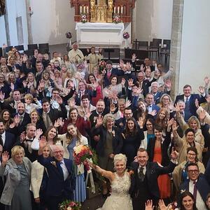 Nach so einer schönen Messe durfte die Hochzeitsgesellschaft natürlich von ganzem Herzen für ein gemeinsames Foto jubilieren.