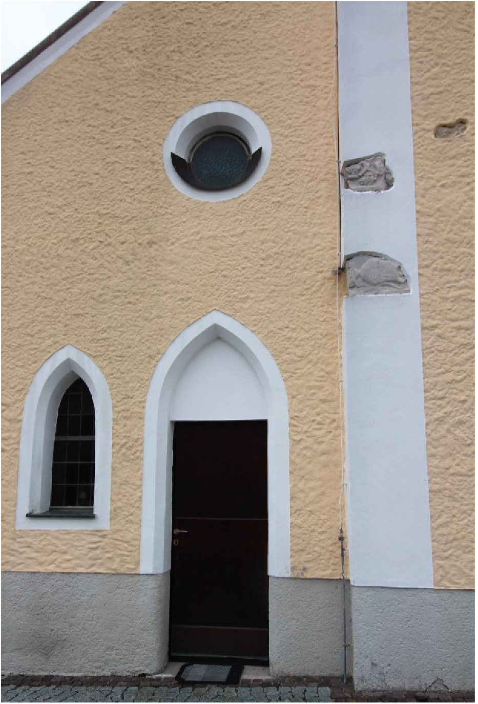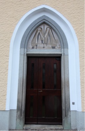 | Aufnahme 2019: Glasfenster außen Fischblasenmaßwerk | Aufnahme 2019: Eingang zum Aufbahrungsraum |
