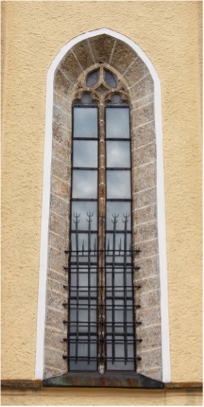 Aufnahme 2019: Nordseite der Kirche mit den beiden Spitzbogenfenstern und dem Rundfenster |