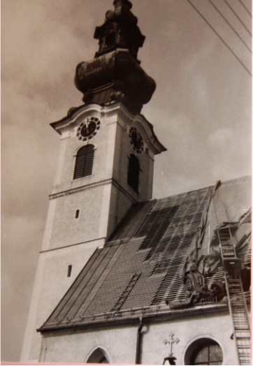 Im Herbst 1987 erfolgte die Neueindeckung der Pfarrkirche durch die Welser Firma A. Niedermaier. Der Dachstuhl wies teilweise Unebenheit auf, dadurch musste sehr viel ausgeglichen werden. Die Dachlatten wurden fast zur Gänze ersetzt, Verblechungen und Dachrinnen ausgewechselt. Viel Bewunderung hatte der Mut der Dachdecker ausgelöst. Das Dach über dem Langschiff hat eine Steilheit von 60 %, über der Apsis über 70 %. Die Ziegel wurden mit Klammern als Schutz gegen Windschäden befestigt.