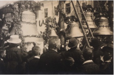 Der Festzug zog in die Kirche ein, wo der hochwürdigste Generalvikar die Glockenpredigt hielt. Nach dem Segen war dann die Weihe der Glocken auf dem Kirchenplatz. Die Zeremonie wurde erklärt und in Deutsch vorgebetet, dazwischen sang der Kirchenchor, durch den Kinderchor verstärkt, die von Prof. Wimmer vertonten Glockenlieder. Nach der Weihe wurde gleich mit dem Aufziehen der Glocken begonnen. Alt und Jung blickte gespannt nach oben, wie eine Glocke um die andere mühelos in die Höhe schwebte. Kurz nach 18 Uhr waren die Arbeiten beendet. In einem Glockenweihespiel erklangen dann die einzelnen Glocken der Reihe nach. Die Glocken wurden in St. Florian gegossen.