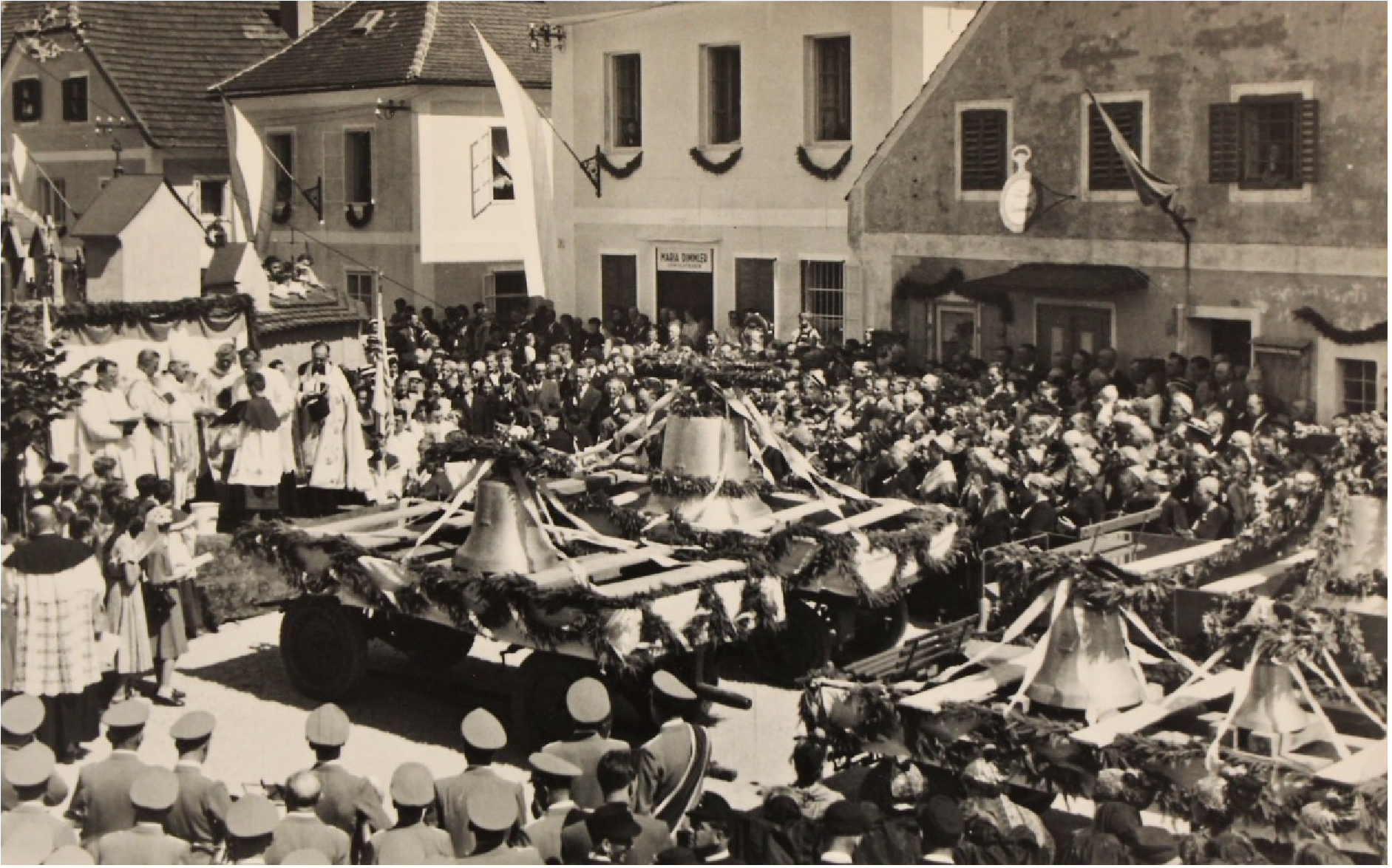 Seit dem 4. Juli läuten wieder neue Glocken in Gunskirchen. Ein langer Zug bewegte sich zur Glockenweihe vom Pfarrhof in Wallnstorf auf Gunskirchen zu. Den Festzug eröffneten 16 Vorreiter in Landestracht, dann kamen die Schulkinder, die Katholische Jugend, der Trachtenverein, die Musikkapelle in ihrer neuen Sommeruniform, die fünf Züge der Feuerwehr und die Glockenwagen. Schön geschmückt, von prächtigen Pferden gezogen, waren sie voll weißgekleideter Mädchen. Als erste die Martinsglocke mit 1143 Kilo, dann die Marienglocke mit 610 Kilo, als dritte die Florianiglocke mit 357 Kilo, sodann die Josefiglocke mit 252 Kilo und zum Schluss das Sterbeglöcklein, dem Hl. Michael geweiht, mit 61 Kilo. Hinter jedem Wagen schritten Goldhauben- und Kopftuchgruppen. Die Frauen fungierten alle als Glockenpatinnen. Nun kamen die ehrwürdigen Tertiärschwestern, die Ministranten und der Klerus mit dem Konsekrator, dem hochwürdigsten Herrn Generalvikar, Prälat Ferdinand Weinberger. Dahinter folgten der Pfarrkirchenrat mit dem Glockenausschuss, die Gemeindevertretung und die Festgäste.