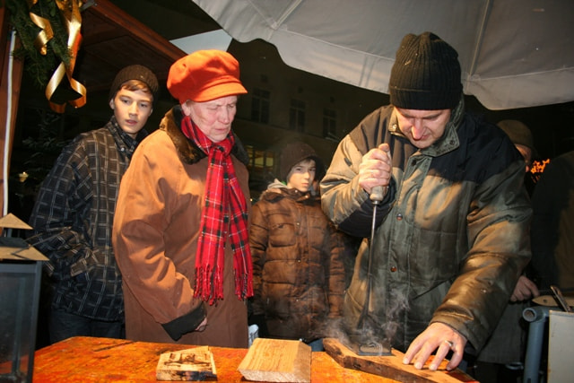 Auf zumindest 235 Jahre altem, ehemaligem Kirchturmholz werden per heißem Metallstempel zwei Motive eingebrannt - als eine etwas andere Erinnerung an die Turmsanierung 2010.
