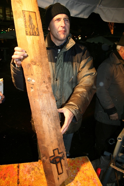 Weihnachtsmarktbesucher können sich ein altes, einzigartiges Holzstück aussuchen - und auch das Motiv, das dann beim Markt auf einer vorbearbeiteten Fläche ins Holz gebrannt wird. Dazu gibt es ein Echtheitszertifikat und einen Spruch. Denn jedem Käufer soll das geschichtsträchtige Turmholzstück zum Segen werden - so wie es der Kirche 235 Jahre lang auch zum Segen gewesen war. Der Erlös dient, wie könnte es anders sein, der Turmsanierung.