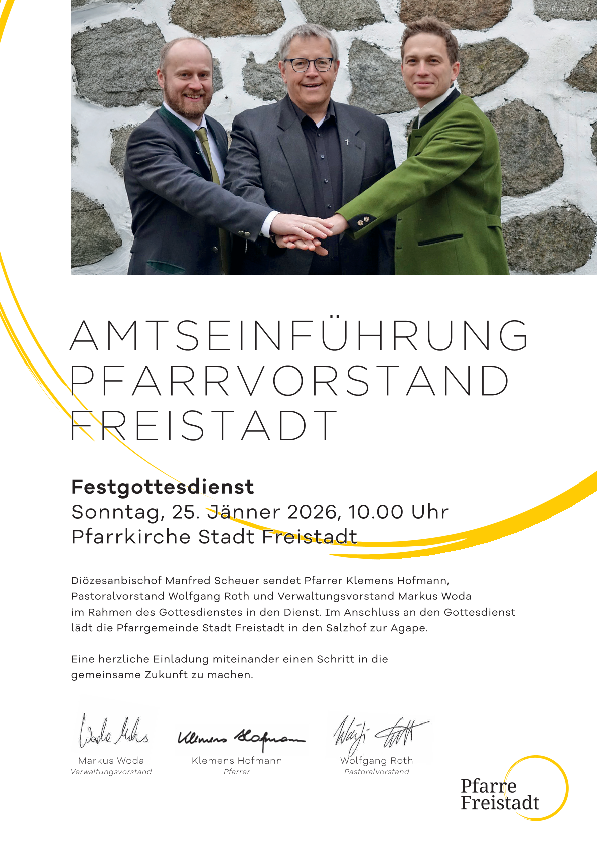 Am 25. Jänner werden Klemens Hofmann, Wolfgang Roth und Markus Woda bei einem Festgottesdienst in der Stadtpfarrkirche Freistadt von Bischof Manfred Scheuer in ihr Amt eingeführt.