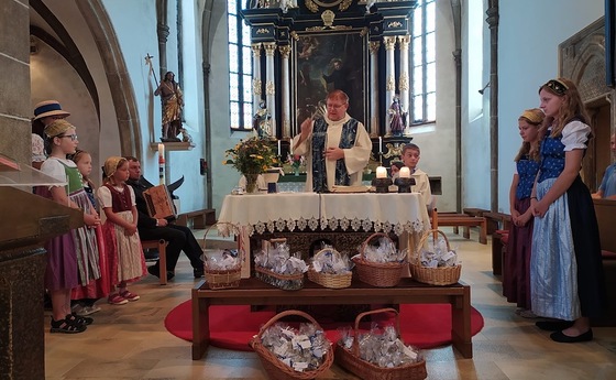 Für den Festgottesdienst am Hochfest der leiblichen Aufnahme Mariens in den Himmel (Mariä Himmelfahrt) bereitete die Hut-, Kopftuch- und Goldhaubengruppe Gutau Säckchen mit Kräutersalz für die Weihe vor.