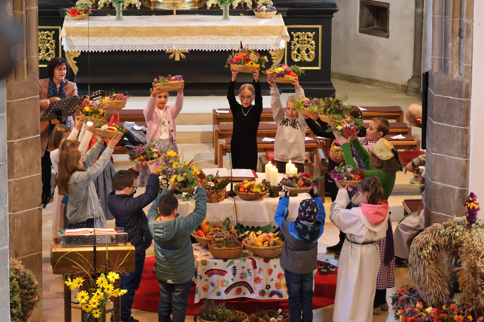 Am 6. Oktober feierten wir bei schönem Wetter den Erntedankgottesdienst am Parkplatz vor der Schule. Die Erntekrone wurde in diesem Jahr von den Ortschaften Neustadt und Schöferhof gestaltet.