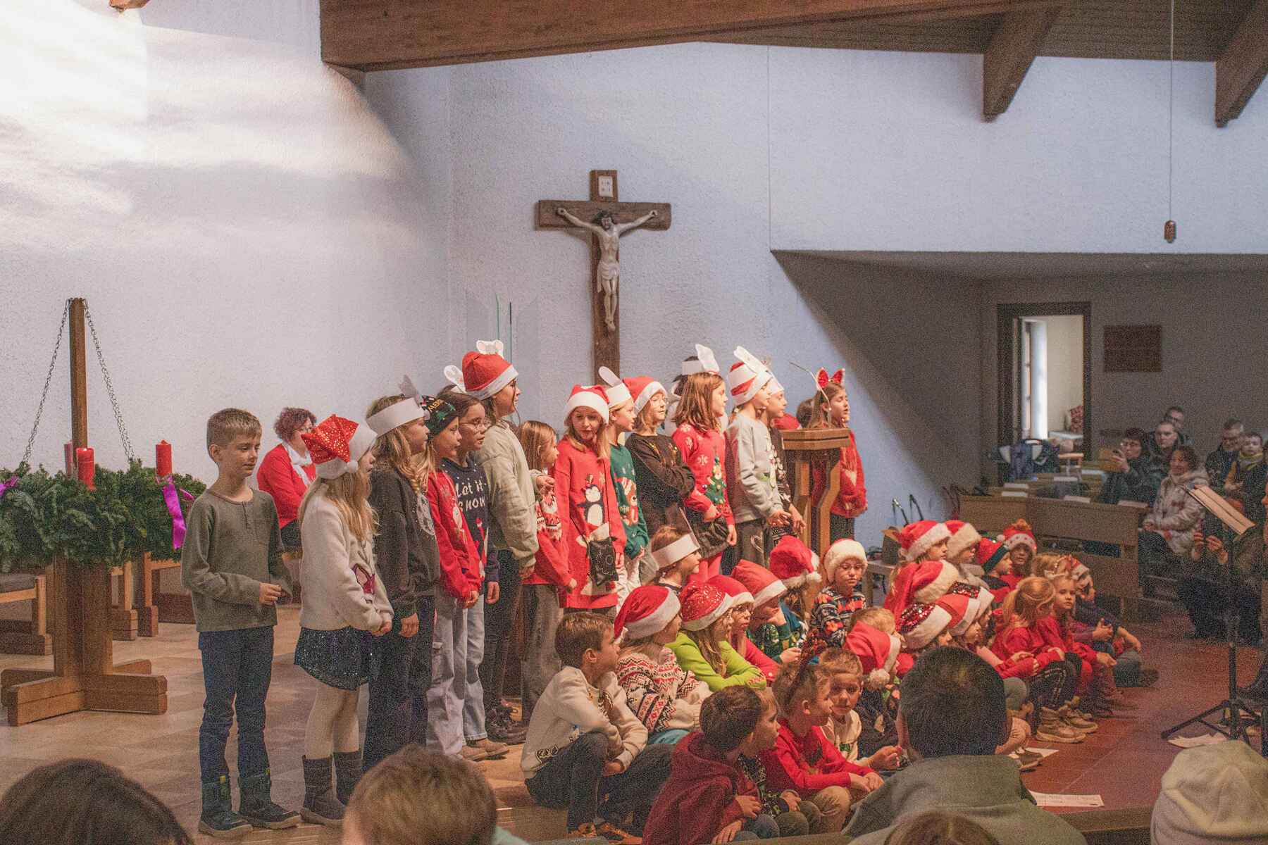 Schülerinnen und Schüler der Volksschule und ihre Lehrerinnen sowie Direktorin Martina Ketterer-Hager begeisterten die Zuhörerinnen und Zuhörer mit vorweihnachtlichen Liedern am Vormittag in der Pfarrkirche.