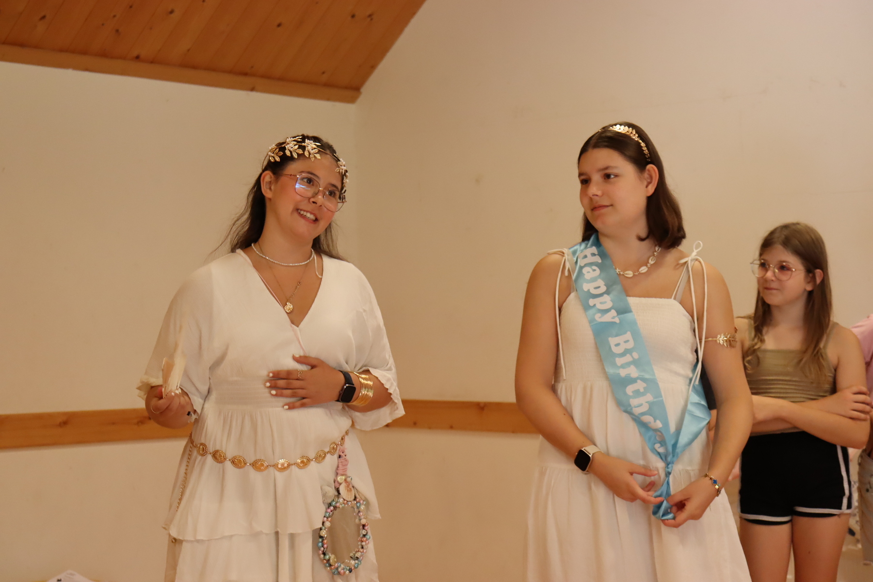 Der Mittwoch war besonders abwechslungsreich. Am Vormittag fanden die olympischen Spiele statt, bei denen die Kinder in Teams gegeneinander antraten und ihr sportliches Können zeigen konnten. Von Geschicklichkeit über Ausdauer bis hin zu Teamarbeit war alles gefragt – und der olympische Gedanke „Dabei sein ist alles“ stand natürlich im Mittelpunkt. Am Nachmittag folgte das beliebte Stadtspiel, bei dem die Kinder durch kreative Aufgaben und witzige Challenges „Geld“ verdienen konnten. Dieses konnte später an verschiedenen Stationen wieder ausgegeben werden, was für ausgelassene Stimmung sorgte. Der Tag erreichte schließlich seinen Höhepunkt in einer spannenden Abend-/Nachtwanderung. Mit Taschenlampen machten sich die Kinder auf den Weg – und tatsächlich gelang es, die fünf Schlüssel des Olymps zu finden. Somit konnte der festlich geschmückte Olymp geöffnet werden, worauf sich alle schon sehr gefreut hatten.