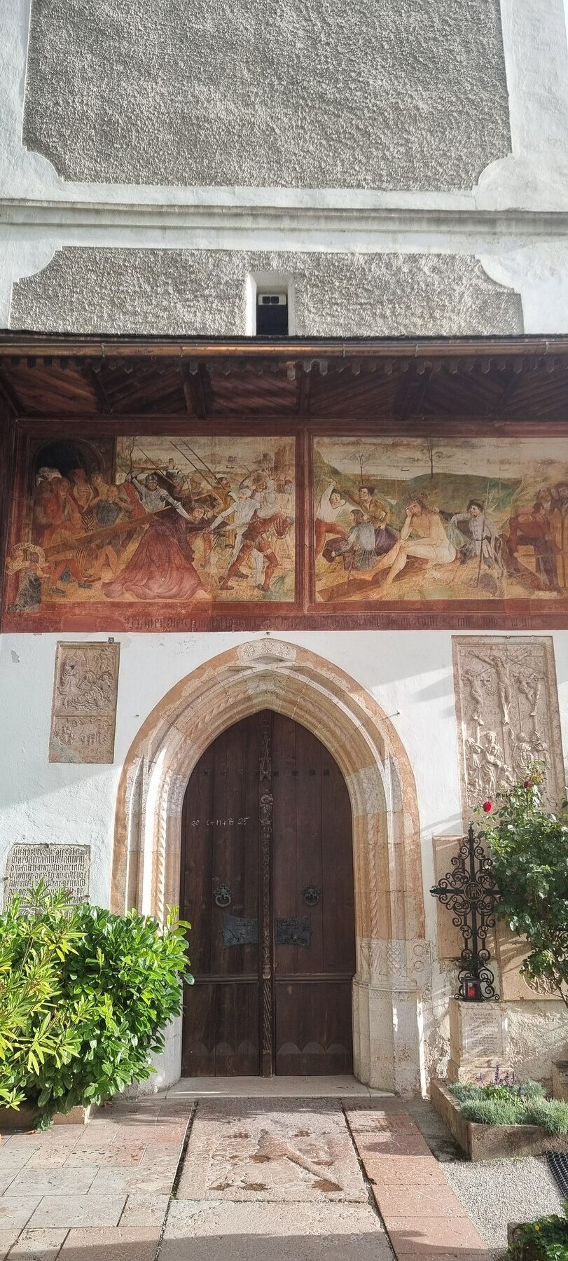 Über dem Tor befinden sich Fresken eines unbekannten Meisters, die 1910, 1936 und 1962 restauriert wurden. Sie gehören vermutlich zur Donauschule und zeigen die Kreuztragung und die Kreuzigung Christi. Besonders bemerkenswert ist die äußerst seltene Darstellung eines „Zahnwehchristus“ im rechten Fresko.