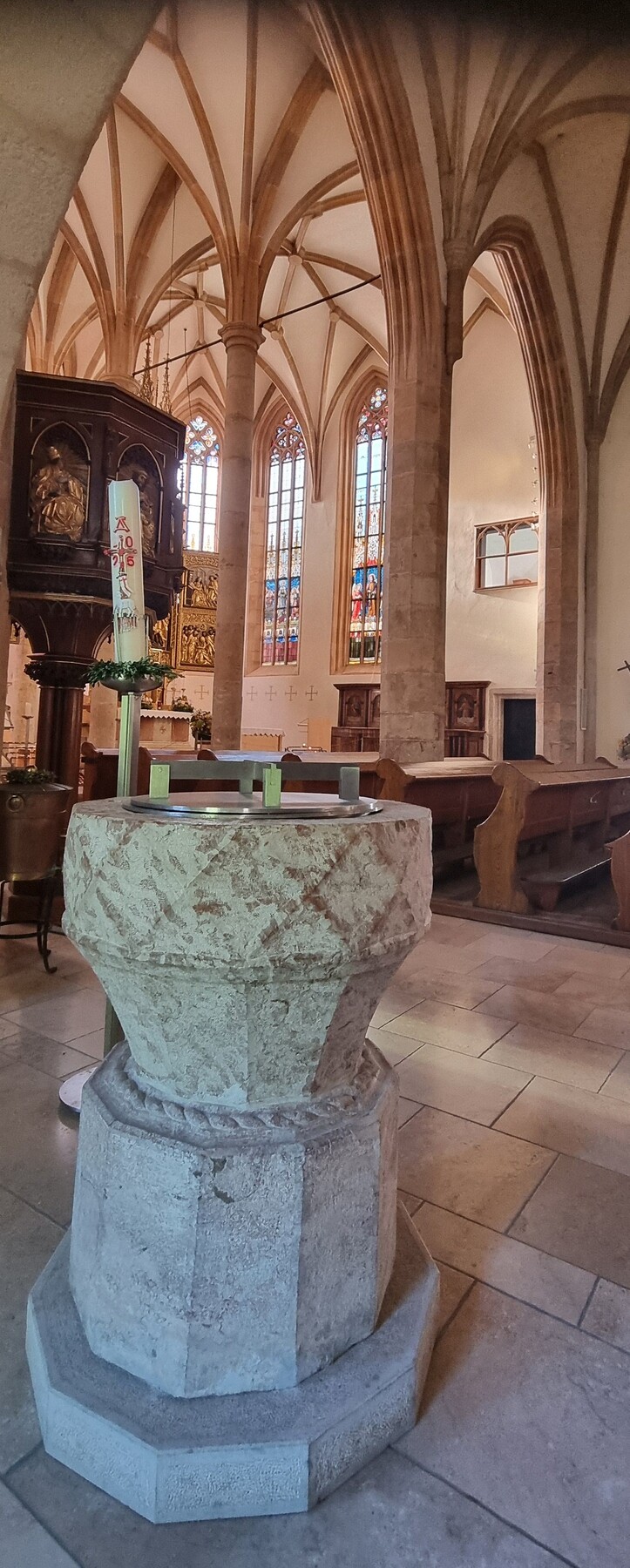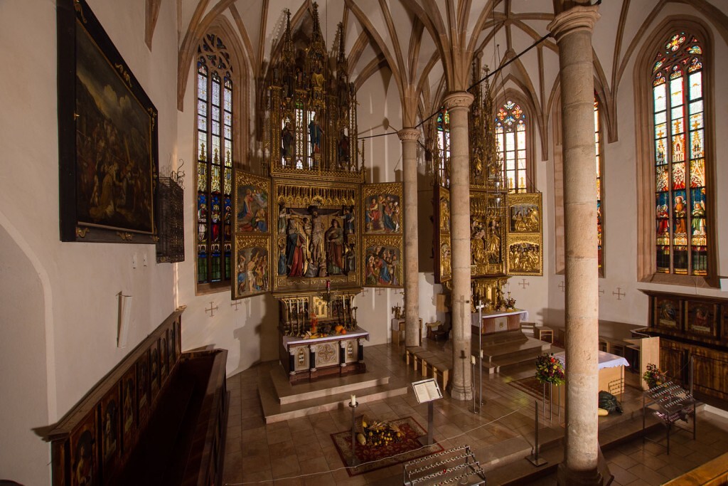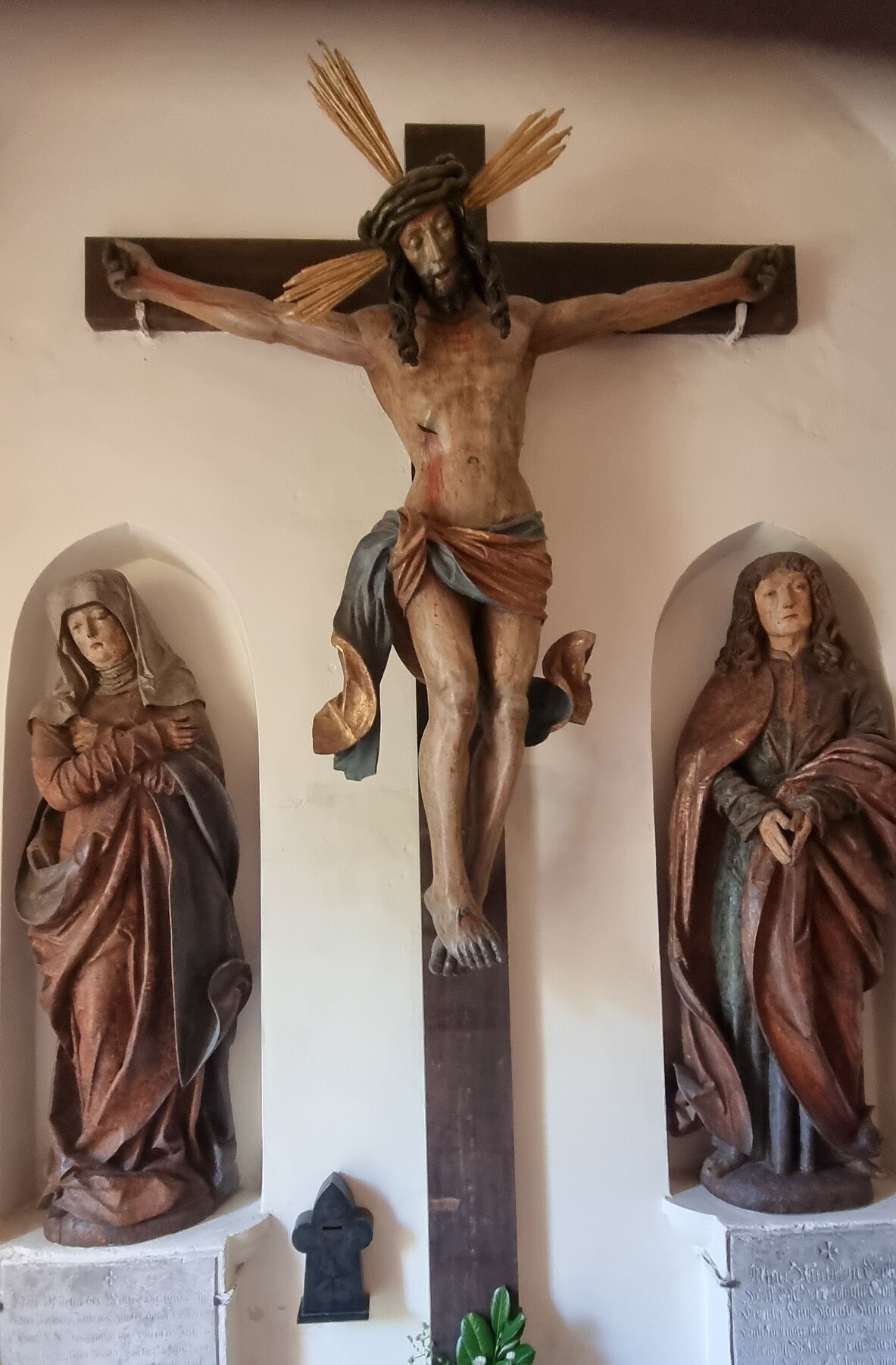Im Vorraum begegnet man einer eindrucksvollen spätgotischen Kreuzigungsgruppe (um 1500). Sie wird dem Künstler des Marienaltares zugeschrieben. Besonders ausdrucksstark sind das Gesicht des Gekreuzigten und die Figur des hl. Johannes.