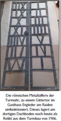 Vergoldung wurde je zur Hälfte den beiden Bürgern Karl Mayer (Nr.50) u. Robert Riedl (Nr.37) übertragen. Auf Schlagers Rat wurde wegen der Blitzgefahr von der Turmvergoldung abgesehen. Die Uhrmacherarbeit erhielt der Uhrmacher Alois Hofbauer. Am 24.November wurden an der Nordseite die von Riedl vergoldeten Zeiger angebracht, am 15.Dezember die anderen. (…) Die alten Zifferblätter und das alte Kreuz samt Kugel erhielt am 3. Dezember der Raidenbauer Jakob Wipplinger gegen das Versprechen, Steine vom Steinmetzplatz in Herrenschlag nach Haslach zu führen. Er verwendet sie für das Gitter seines neu gebauten Wirtshauses in Raiden.“
