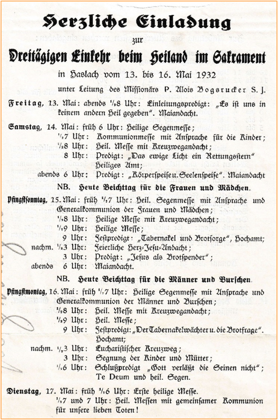 Liebe Haslacher! Wie wenn an einem recht stürmischen Tag, da der Himmel schwarz und finster dreinschaut, die Sonne durch die Wolken bricht und liebe freundliche Strahlen herabsendet, so kommt jetzt in der düsteren Zeit der Weltnot das eucharistische Triduum mit seinen Gnadenstrahlen. Es verspricht jedem reichen Segen und mehr Hilfe als man meinen könnte, jedem, der es eifrig mitmacht. In der Zeit des Fortschrittes in allen weltlichen Wissenszweigen hat man geglaubt, die Brotfrage ohne Gott lösen zu können. Alle diese Versuche haben fehlgeschlagen und zu einer großen Brotnot geführt. Der Heilige Geist, der sichere Führer in allen Fragen, von dem der Heiland gesagt: „Er wird euch alles lehren und euch an alles erinnern, was ich euch gesagt habe“ wird uns in diesen Pfingsttagen zur Lösung der Brotfrage hinweisen auf den Tabernakel.