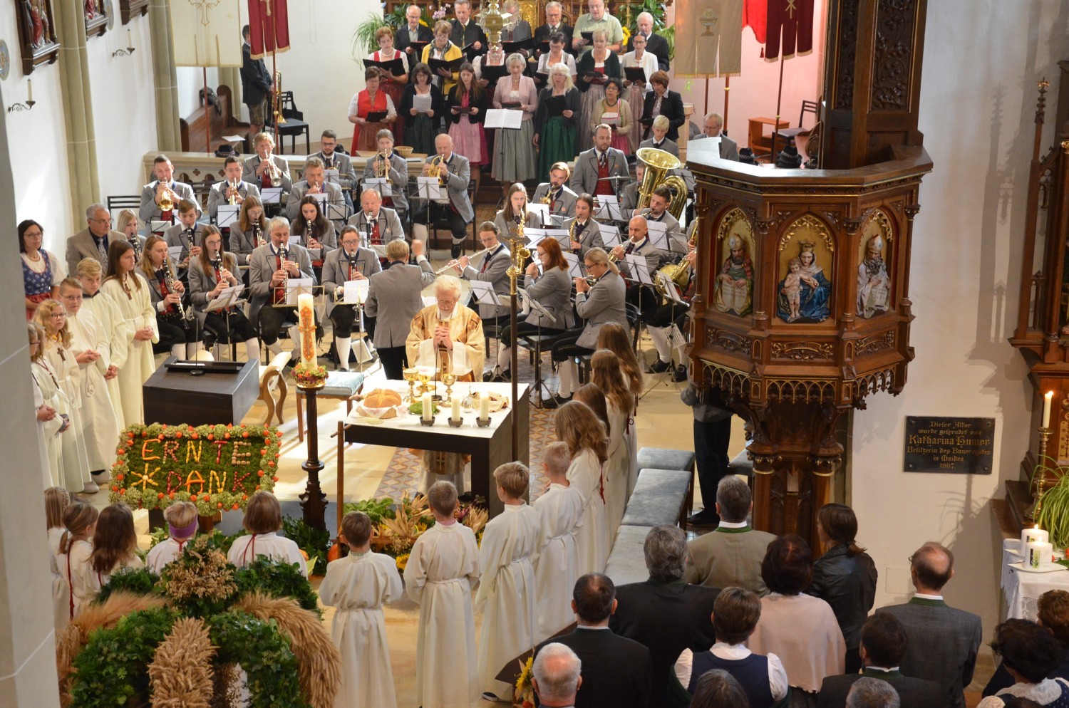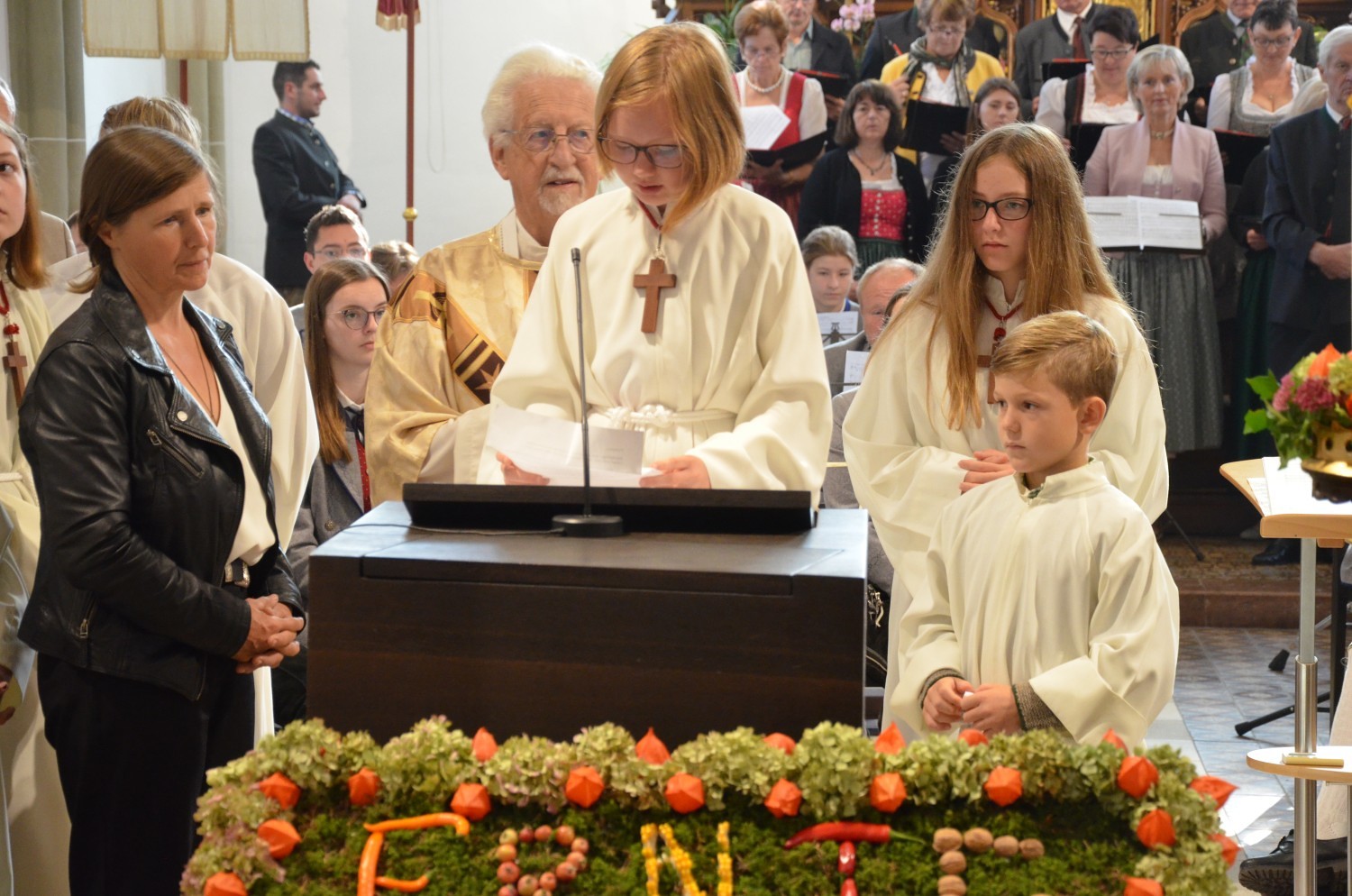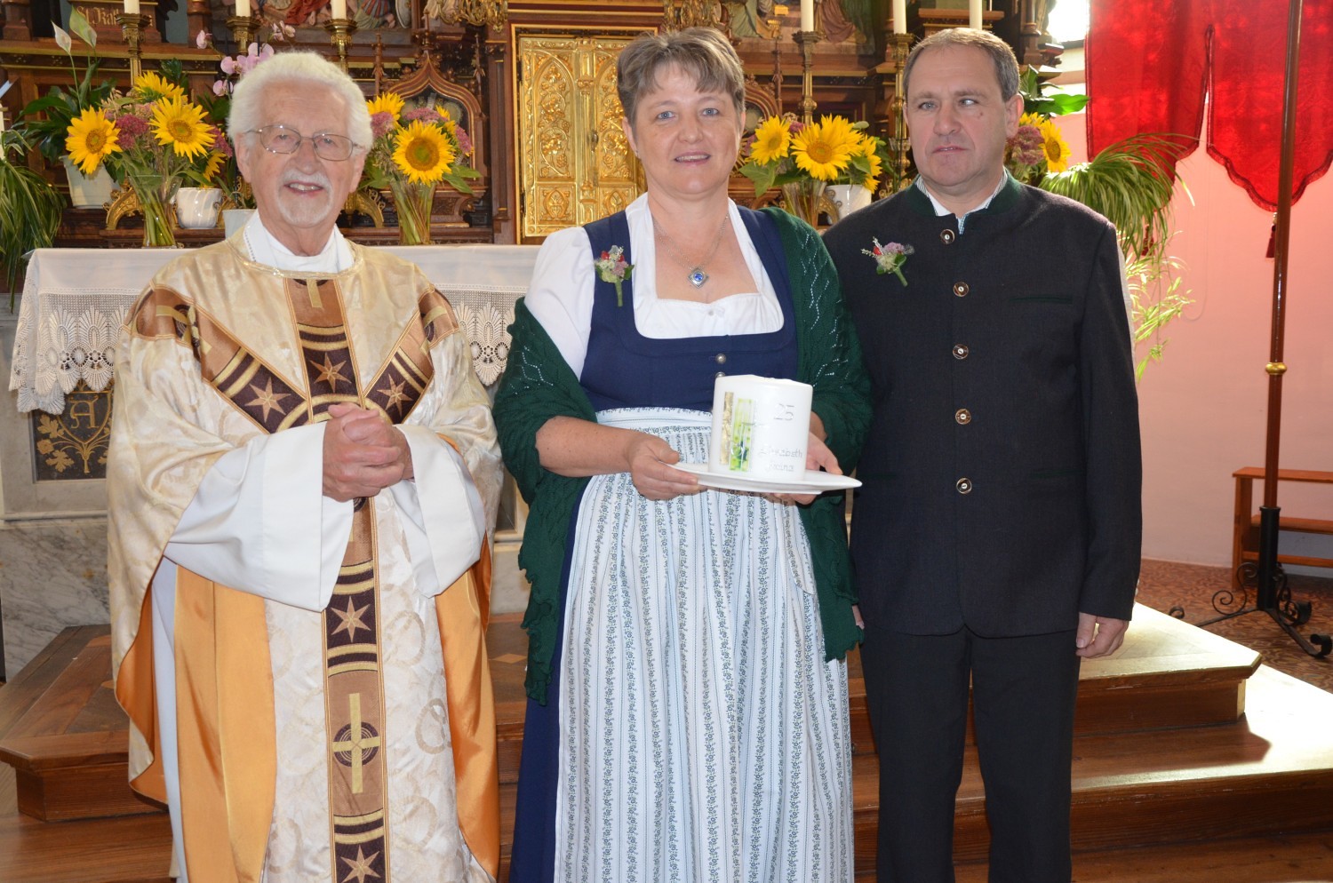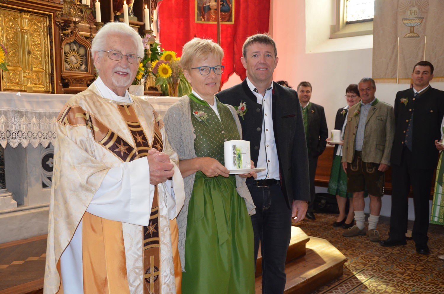Wie jedes Jahr, eröffnete nach dem feierlichen Einzug der Kindergarten mit einem Lied den Dankgottesdienst. Heuer gestaltete erstmalig der Chor mit der Musikkapelle den Gottesdienst musikalisch. Im Zuge dieser Feier wurden auch die Ehejubilare geehrt. Sieben Paare feierten ihre silberne Hochzeit. Drei Paare dankten für 40 Jahre Ehe. Die Goldene Hochzeit feierte ein Paar. Sie erhielten eine Kerze von der KFB/KMB und durften im Anschluss an die heilige Messe beim Pfarrfest ihr Jubiläum noch ausgiebig feiern.