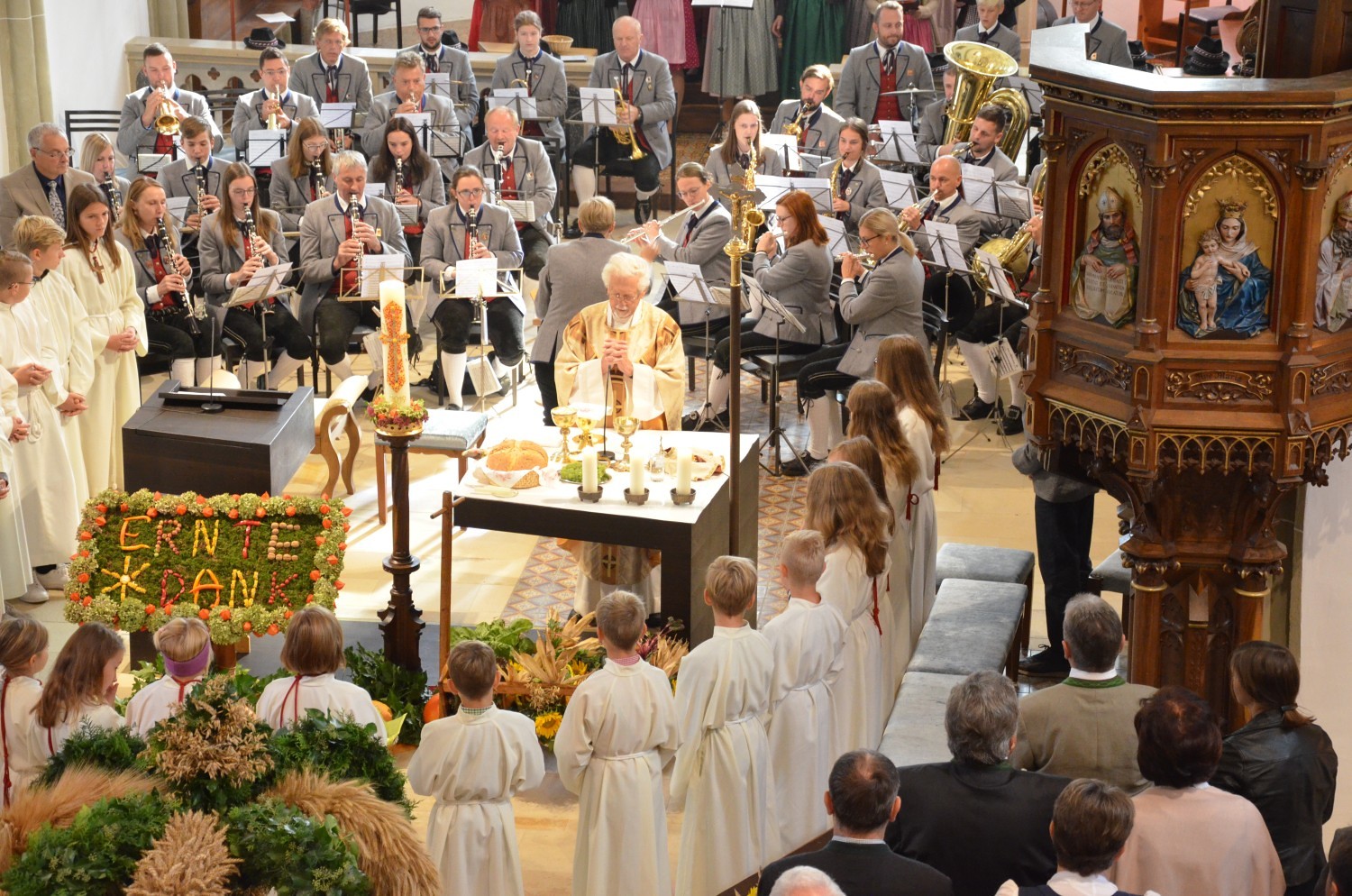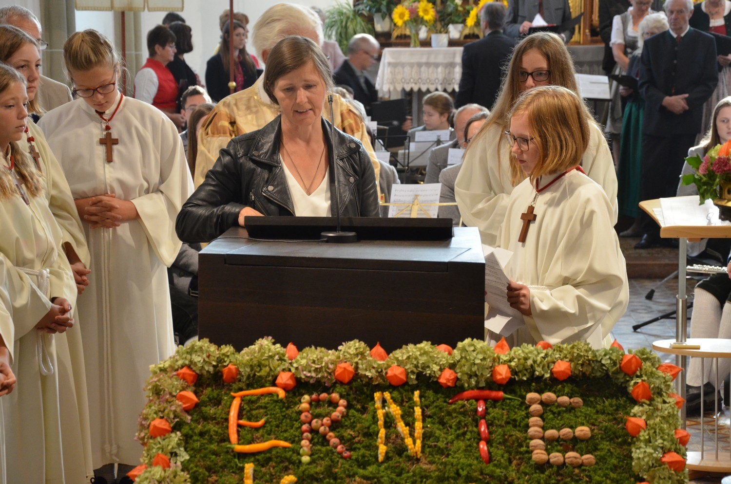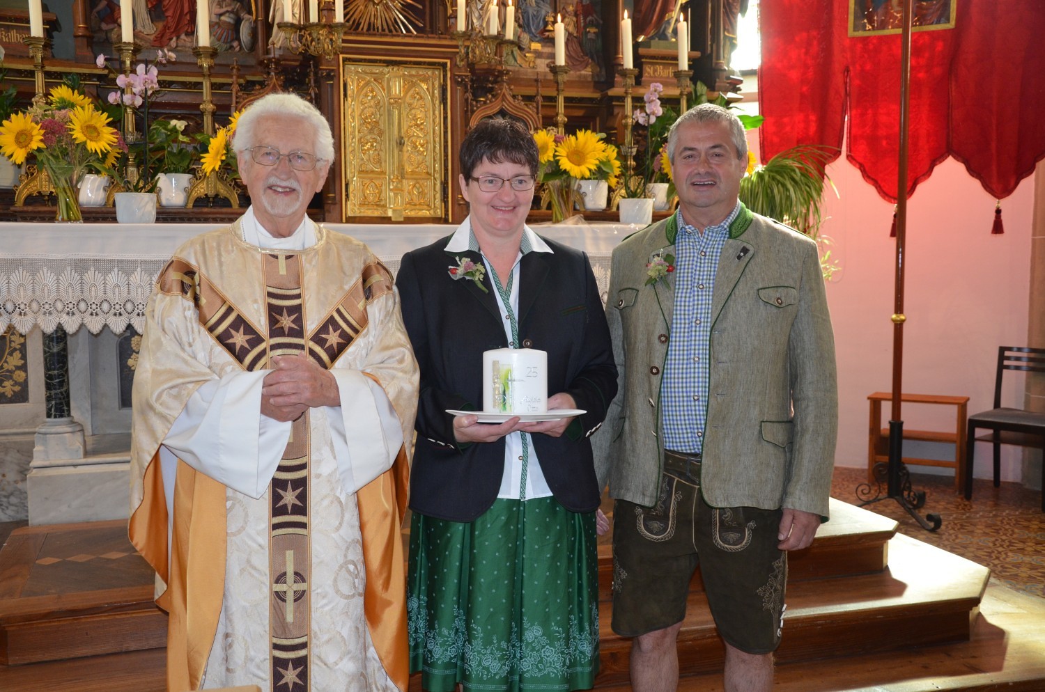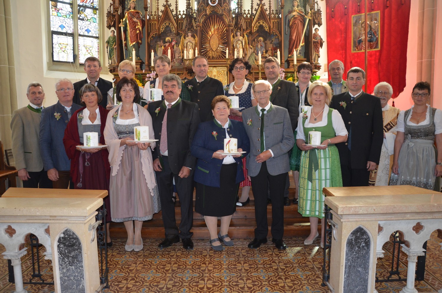 Wie jedes Jahr, eröffnete nach dem feierlichen Einzug der Kindergarten mit einem Lied den Dankgottesdienst. Heuer gestaltete erstmalig der Chor mit der Musikkapelle den Gottesdienst musikalisch. Im Zuge dieser Feier wurden auch die Ehejubilare geehrt. Sieben Paare feierten ihre silberne Hochzeit. Drei Paare dankten für 40 Jahre Ehe. Die Goldene Hochzeit feierte ein Paar. Sie erhielten eine Kerze von der KFB/KMB und durften im Anschluss an die heilige Messe beim Pfarrfest ihr Jubiläum noch ausgiebig feiern.