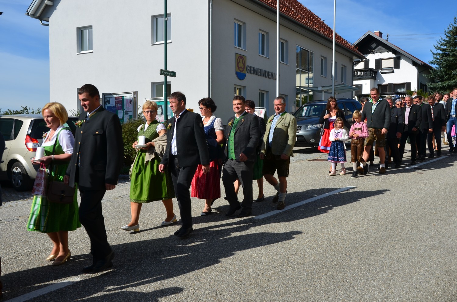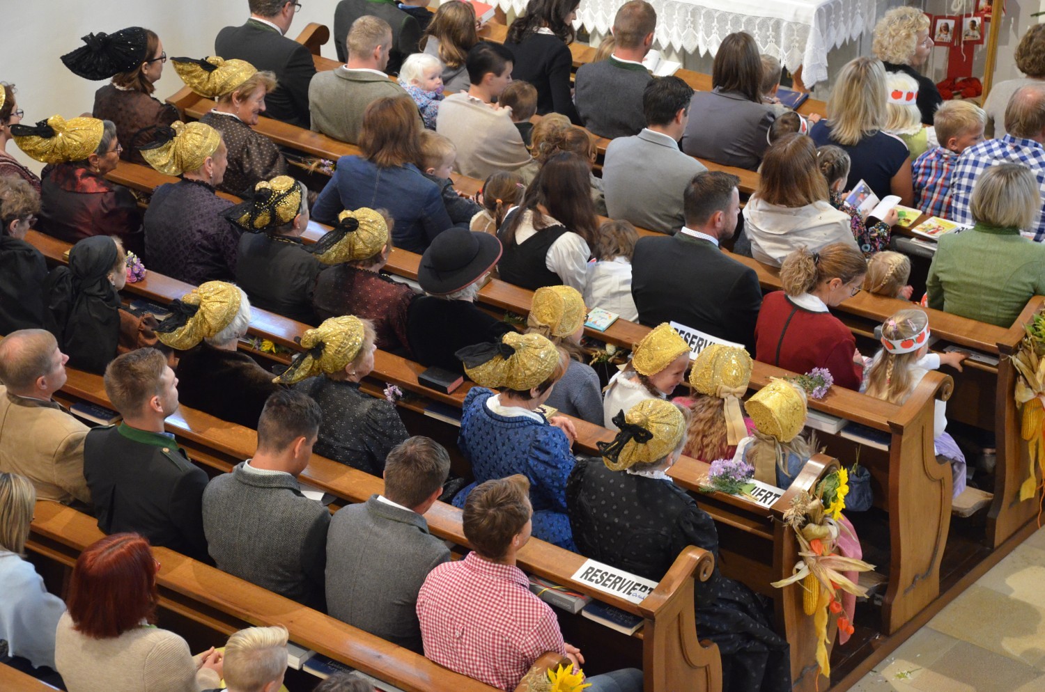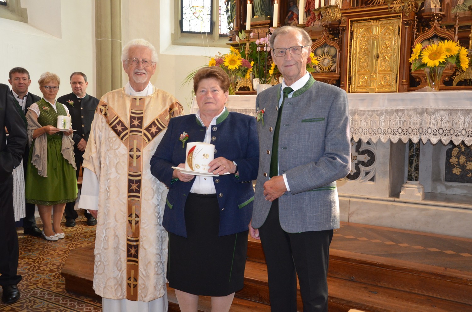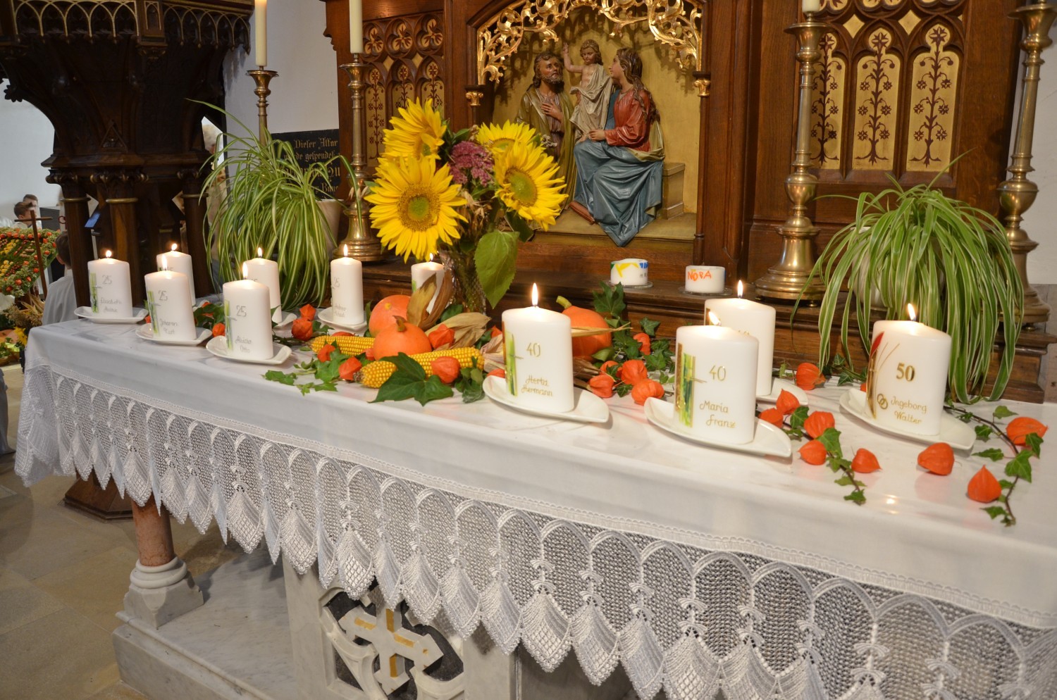Wie jedes Jahr, eröffnete nach dem feierlichen Einzug der Kindergarten mit einem Lied den Dankgottesdienst. Heuer gestaltete erstmalig der Chor mit der Musikkapelle den Gottesdienst musikalisch. Im Zuge dieser Feier wurden auch die Ehejubilare geehrt. Sieben Paare feierten ihre silberne Hochzeit. Drei Paare dankten für 40 Jahre Ehe. Die Goldene Hochzeit feierte ein Paar. Sie erhielten eine Kerze von der KFB/KMB und durften im Anschluss an die heilige Messe beim Pfarrfest ihr Jubiläum noch ausgiebig feiern.