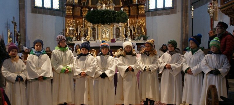 Auf unseren Barockaltären in der Kirche sind schließlich 30 Engelsfiguren zu entdecken, die vielfach bei Aufgaben zu sehen sind, did auch die Ministranten erfüllen. Sie weisen auf Gott hin, sind Kerzenträger oder vollziehen den Weihrachdienst. In vielen Stellen in der Heiligen Schrift ist von Engeln die Rede. Sie sind Boten Gottes, die den Menschen etwas ausrichten oder erklären, sie stärken oder schützen. Auch das Leben Jesu war von Engeln begleitet.