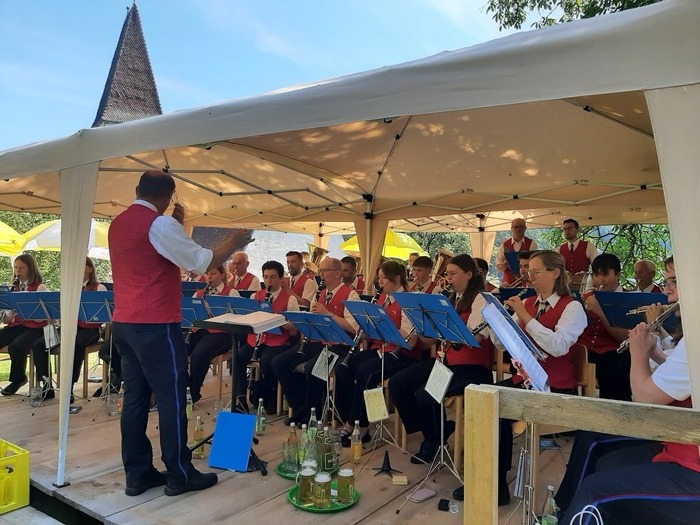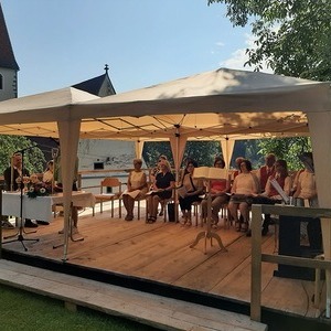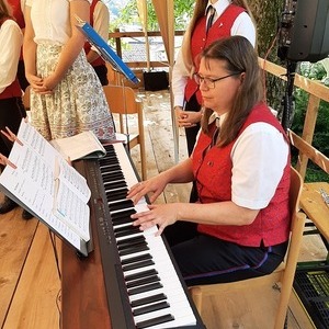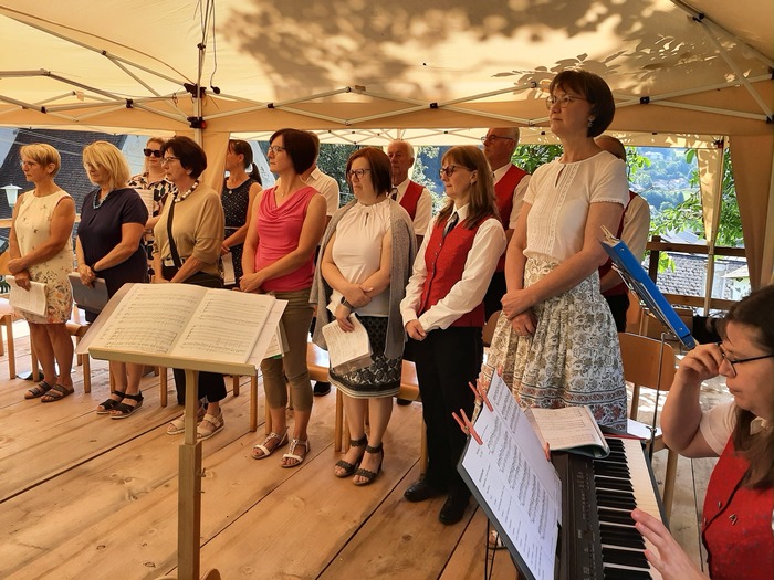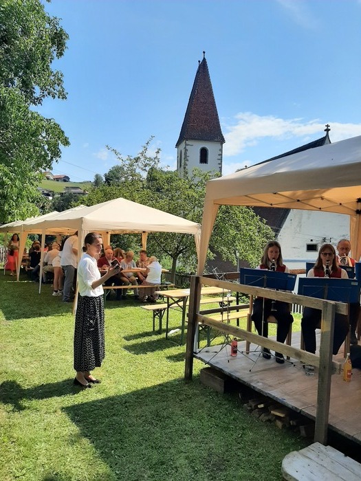 Um 9.30 Uhr feierte die Pfarrgemeinde eine Wort-Gottes-Feier auf der Festbühne unter dem großen Nussbaum. Der Kirchenchor brachte erstmals einige flotte und einfühlsame Musikteile aus der Messe "Frischer Wind" von Stefanie Boxrucker zur Aufführung.