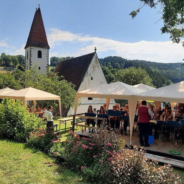 Am Nachmittag genossen viele noch das Beisammensein im wunderschönen Pfarrgarten und lauschten dem Spiel des neuen Blasmusikerensembles "Hirschbacher Perlen". Gegen Abend klang das Pfarrfest noch an der Seidel- und Weinbar in gemütlicher Runde aus.