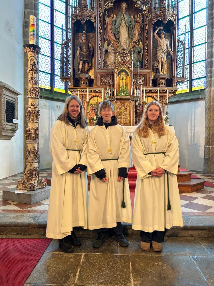Mit einem kleinen Geschenk wurden drei Ministrant:innen aus ihrem langjährigen Dienst verabschiedet. Danke für euren Einsatz!