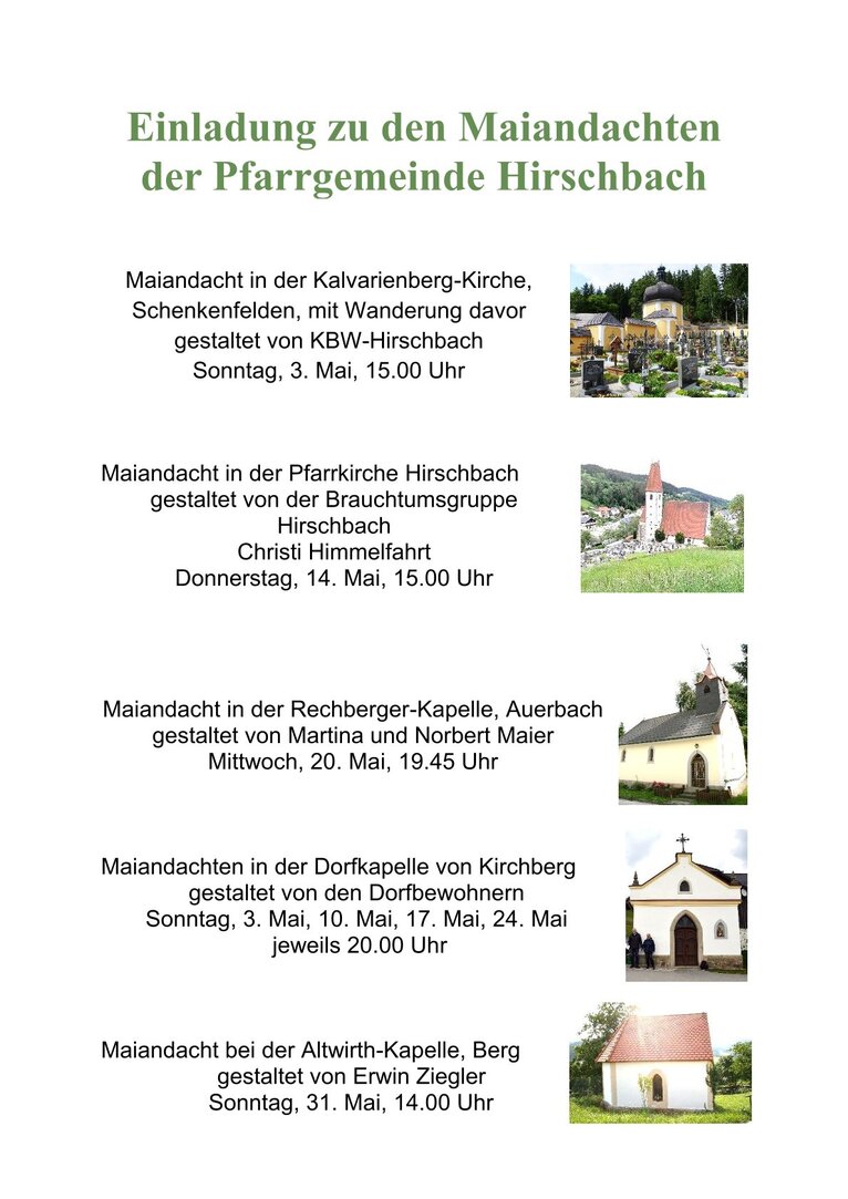 Einladung zu den Maiandachten in der Pfarrgemeinde Hirschbach