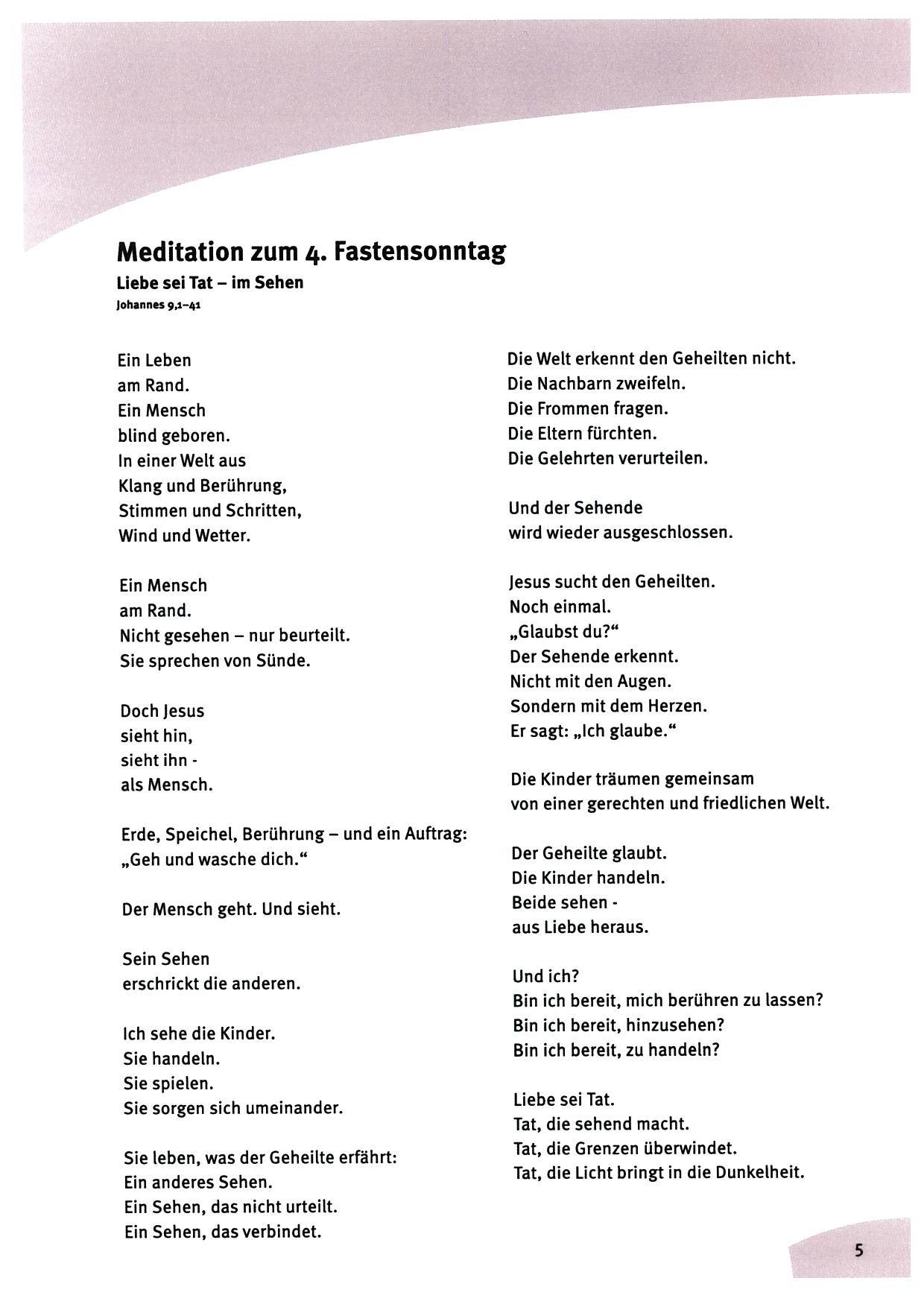 Die folgenden Meditationen sind für die Sonntage der Fastenzeit gedacht, können aber auch darüber hinaus verwendet werden. Sie greifen das jeweilige Sonntagsevangelium auf, verbinden es mit dem Misereor-Hungertuch und öffnen einen Raum für Begegnung: mit Gott, mit uns selbst und mit den Fragen unserer Zeit. Die Texte regen an – zum Nachdenken, zum Beten, zum Schweigen.